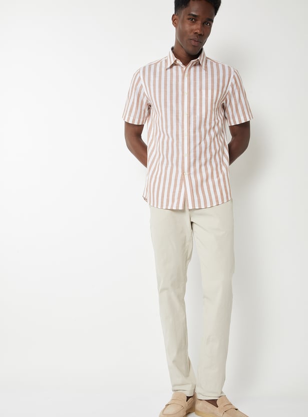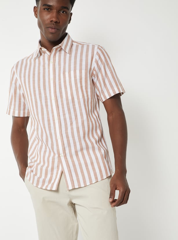 This classic striped shirt features a smart spread collar and a neat button placket. Designed with half sleeves, it also includes a practical patch pocket for everyday ease.
