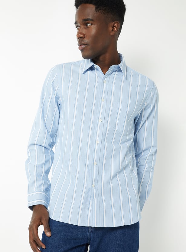 Refined yet versatile, this striped regular fit shirt is designed to elevate everyday dressing. Featuring a spread collar, patch pocket, and button placket, it offers a polished silhouette, while the full sleeves with button cuffs add a classic finishing touch.