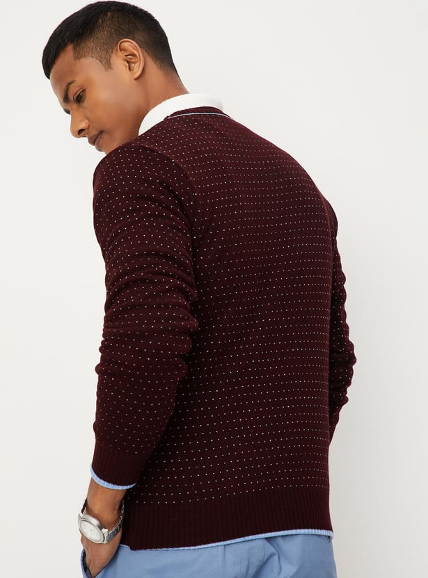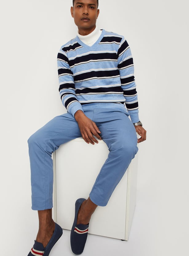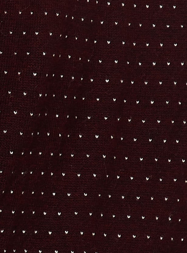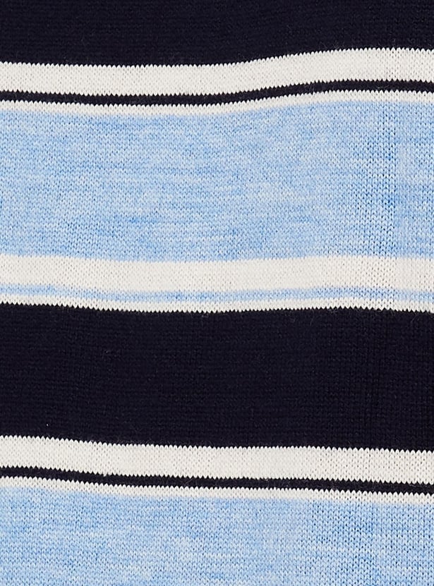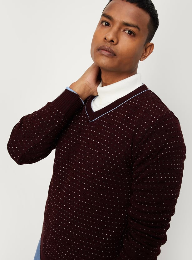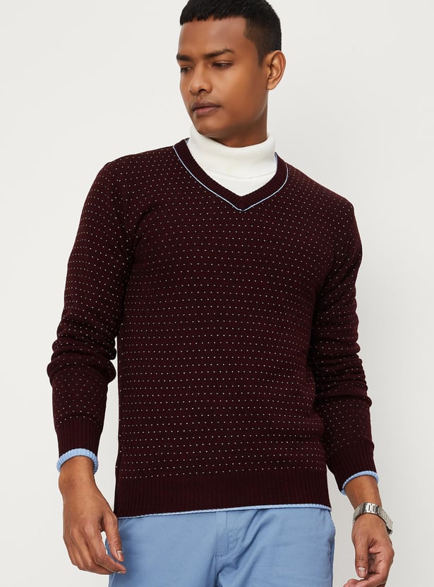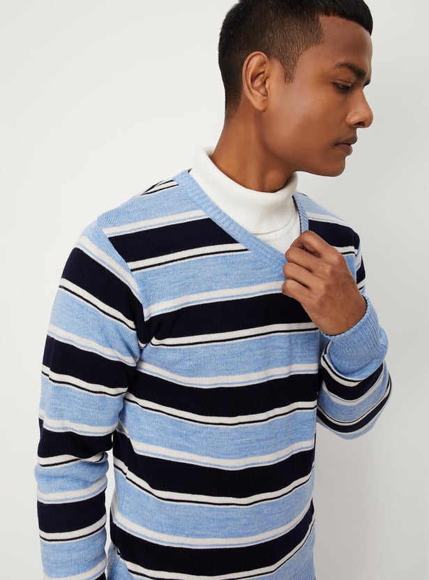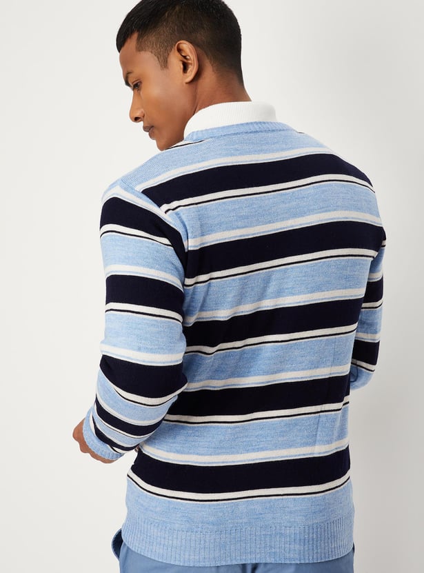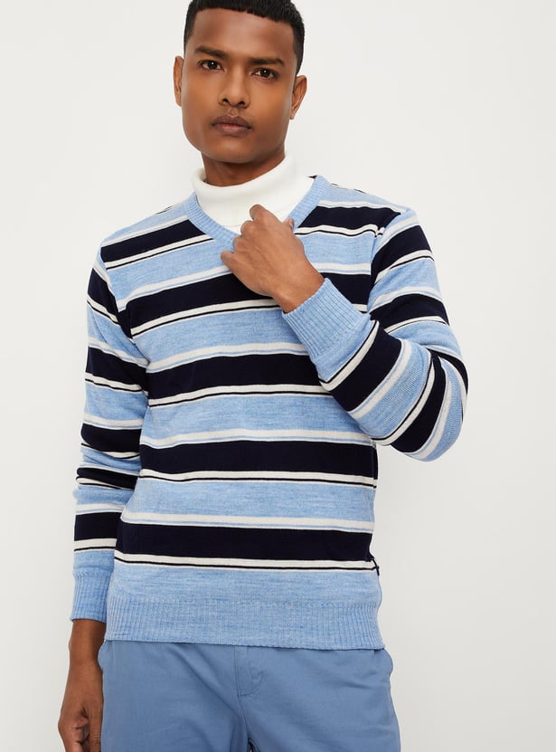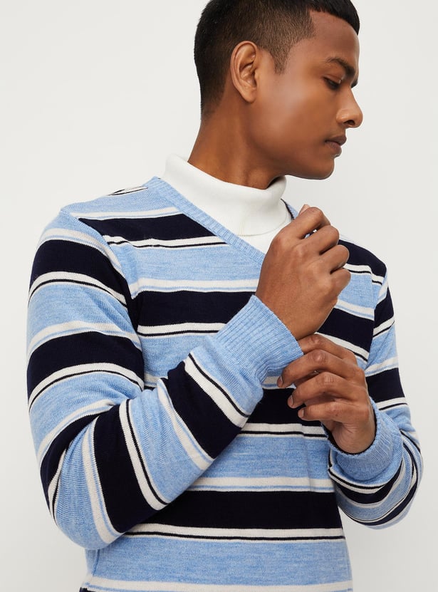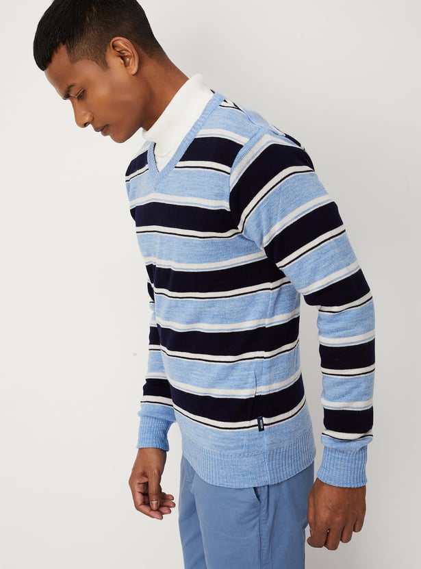 Get winter-ready with this reversible sweater that features a striped pattern on one side and embroidery on the other. It is fashioned with a V-neck, full sleeves, and ribbed trim. Style this sweater over a turtle neck and pair t with trousers and loafers for a cosy, smart look.