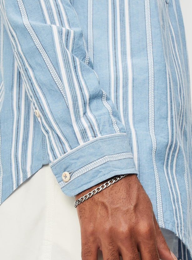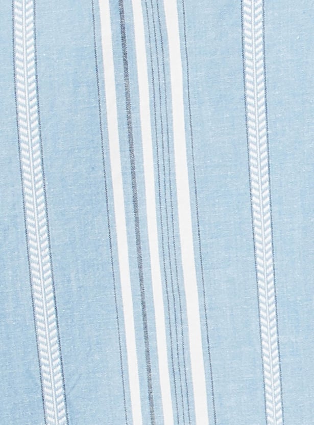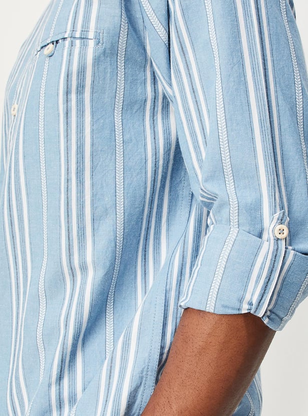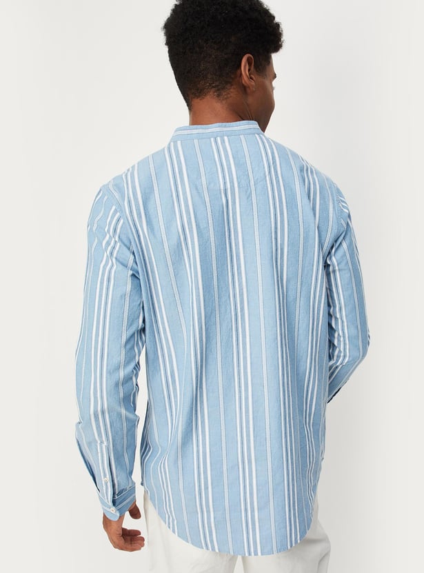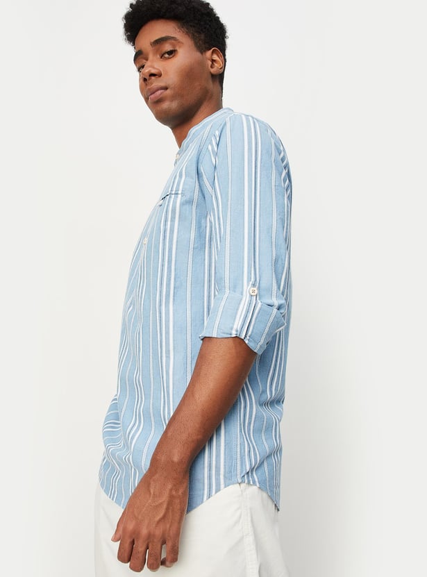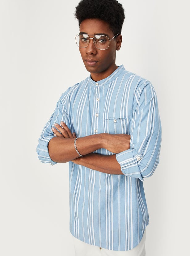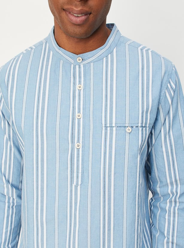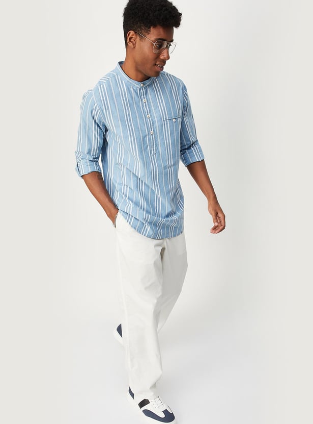 Nail your fusion looks with this short kurta. It features a yarn-dyed striped pattern, a band collar, full sleeves with button tabs, a chest welt pocket with button closure, and a curved hem. Style this kurta with trousers and sneakers to complete the look.