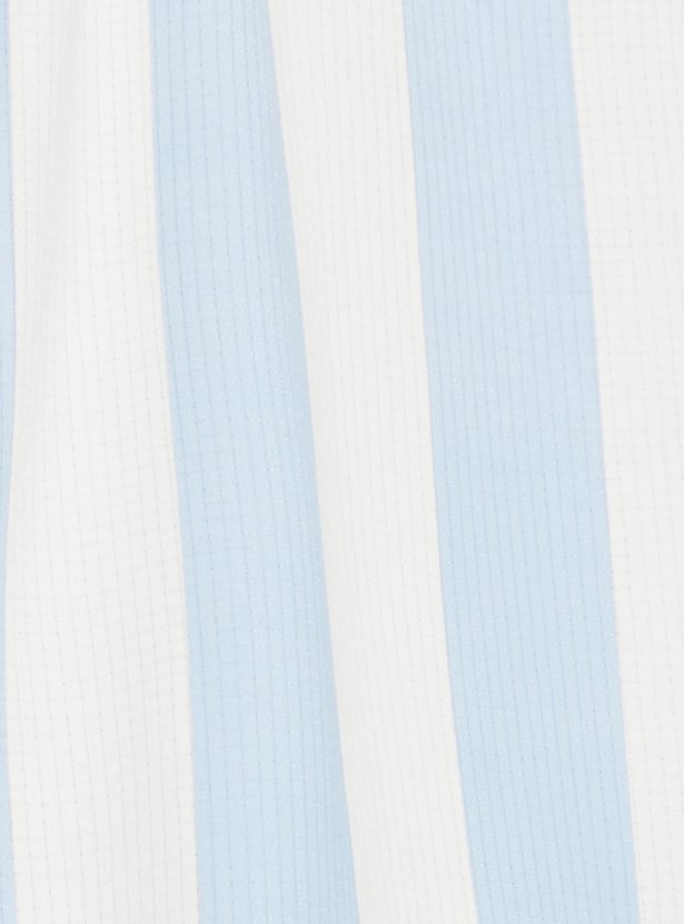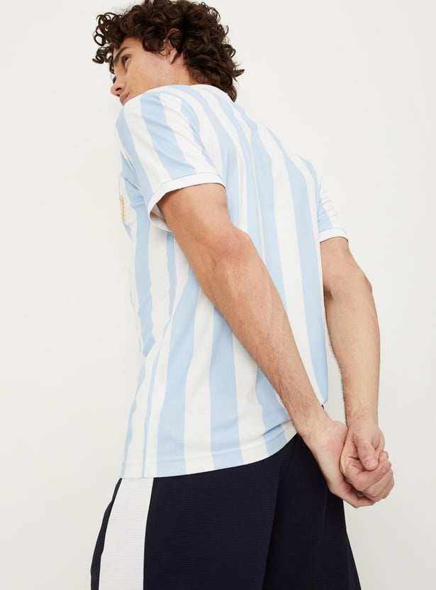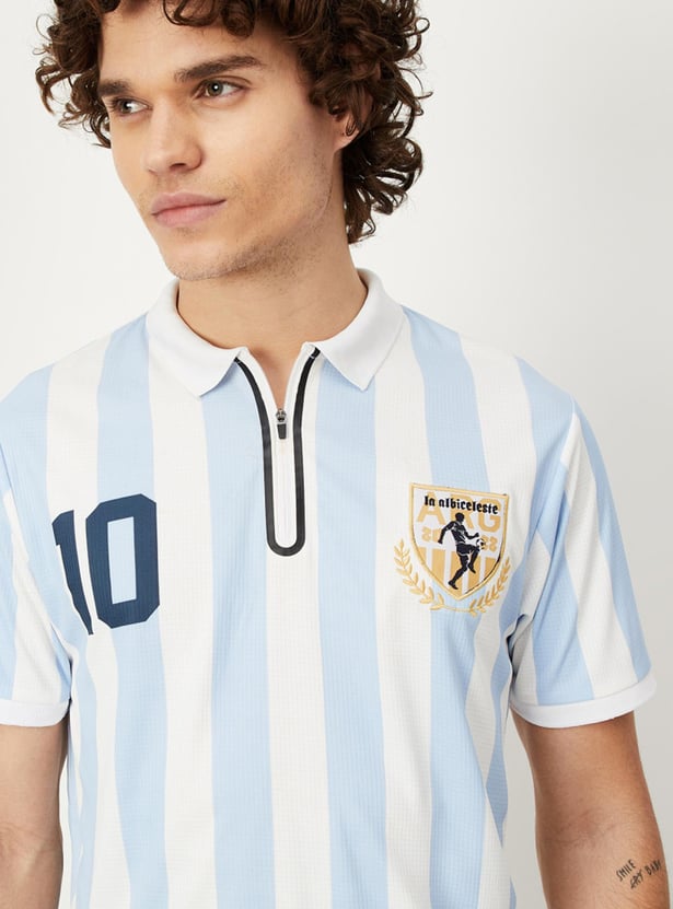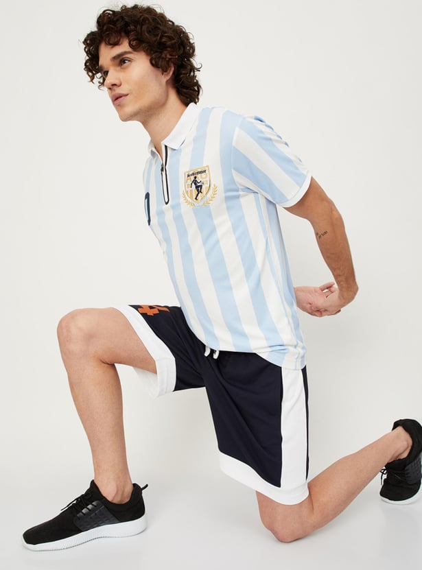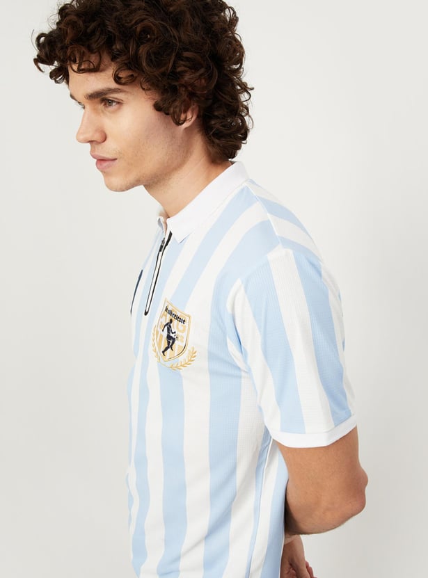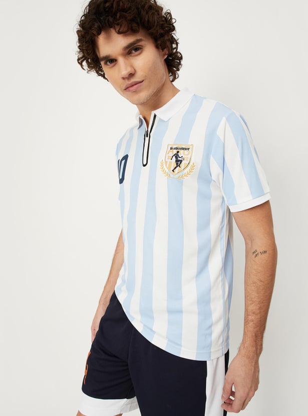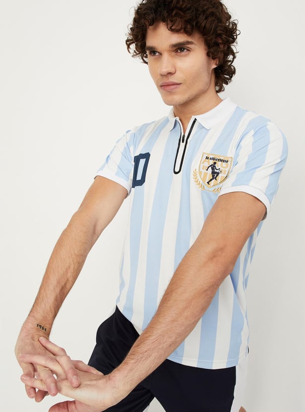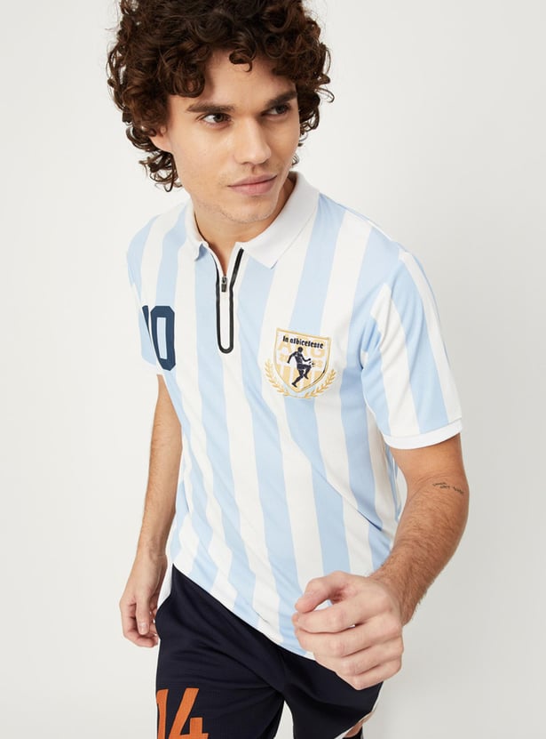 Complete your game-ready look with this T-shirt crafted in a slim fit profile with a striped pattern. It is fashioned with a polo collar, zip placket, short sleeves, and applique at the chest. Complete the athleisure styling with a pair of sports shorts and sneakers.