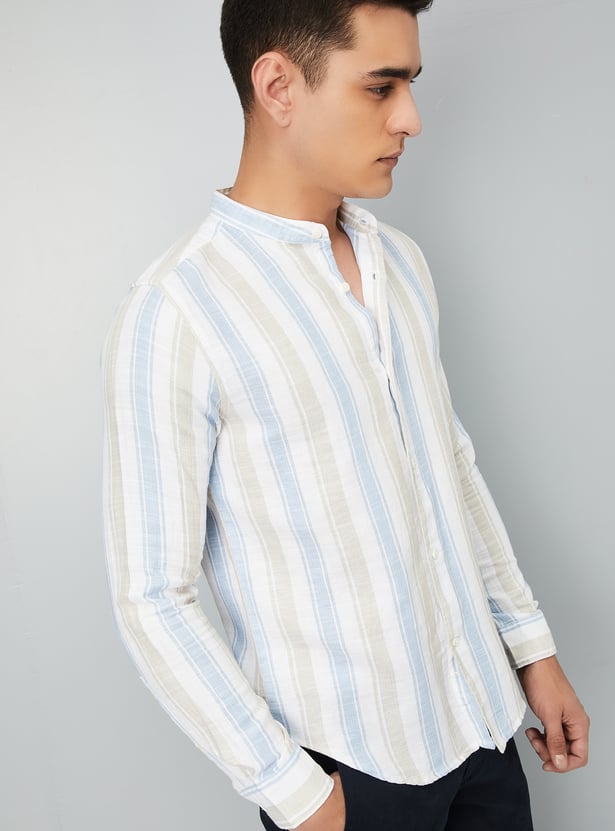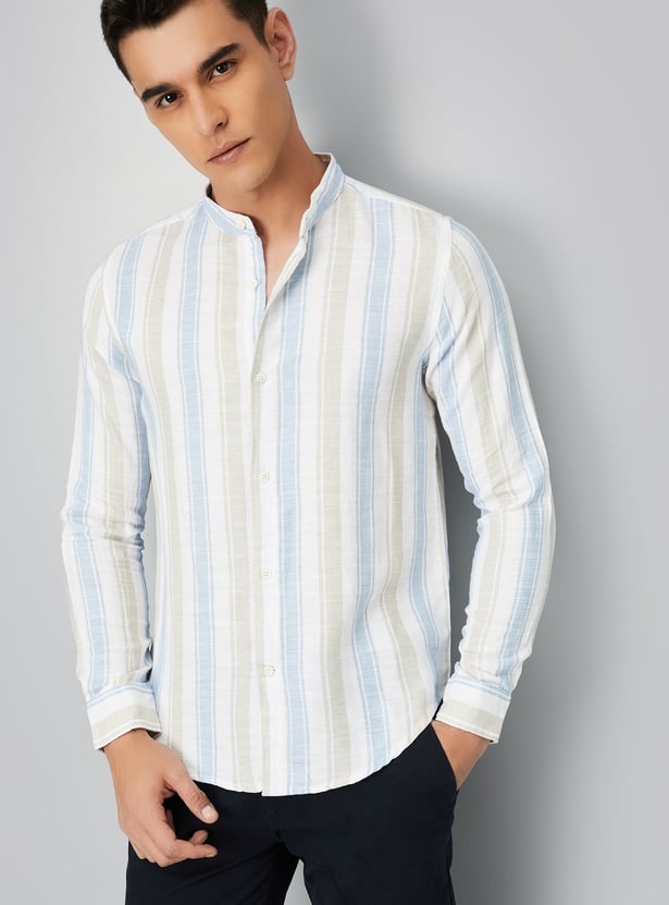 Elevate your wardrobe with this striped slim-fit shirt. Featuring a band collar, button placket, and full sleeves with button cuffs, it offers a sharp, tailored look for any occasion.