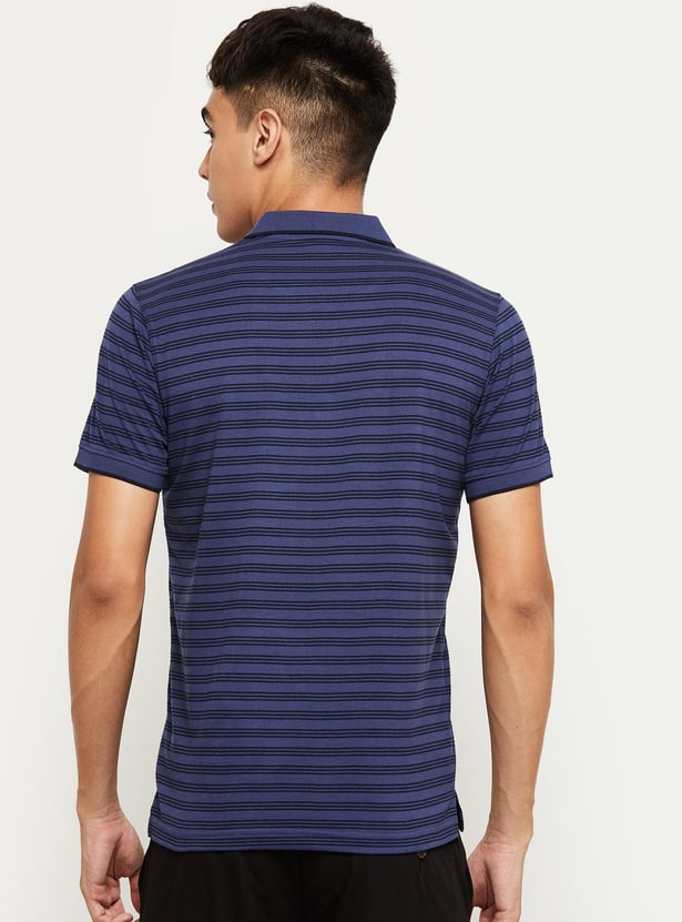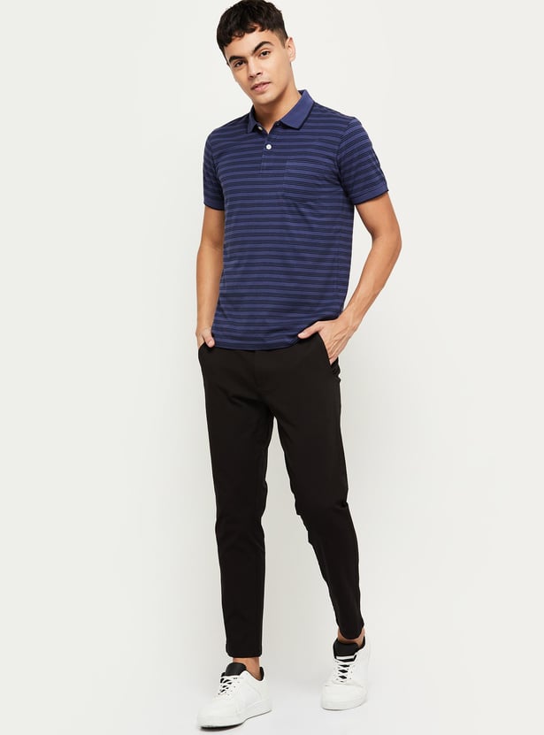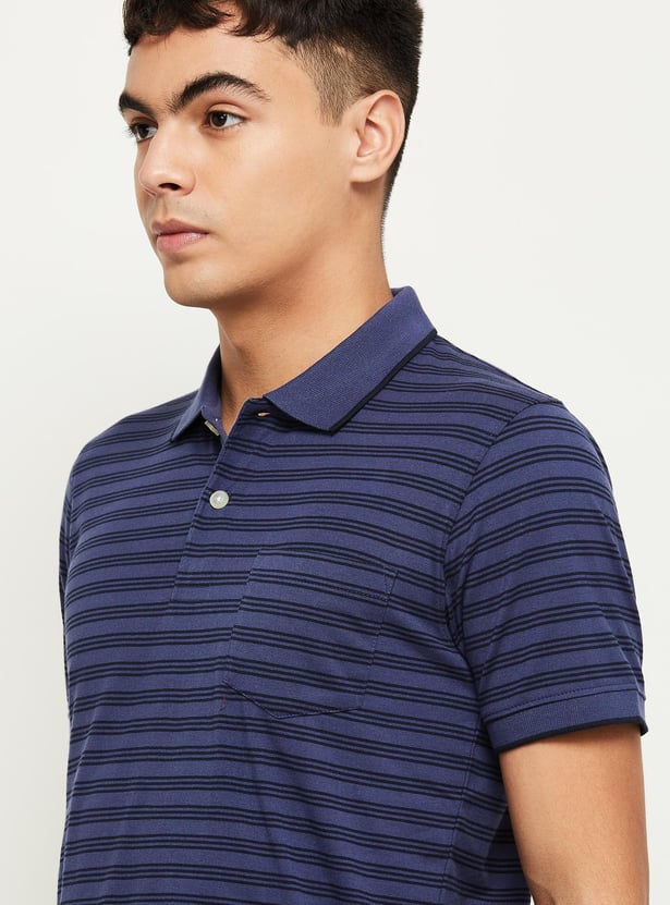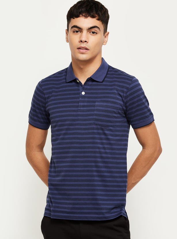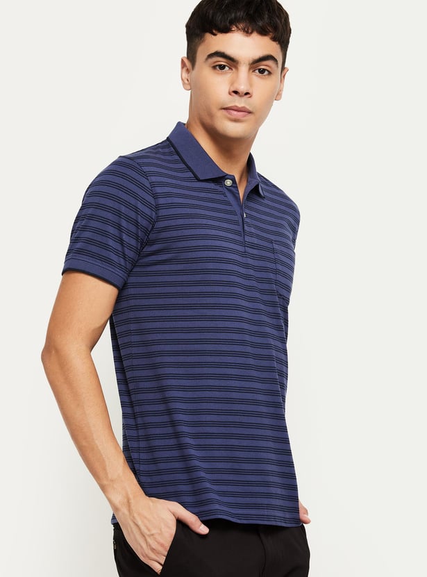 This striped polo t-shirt which has a polo collar, half sleeves, pocket, and a button closure is an ideal pick for your casual collection.