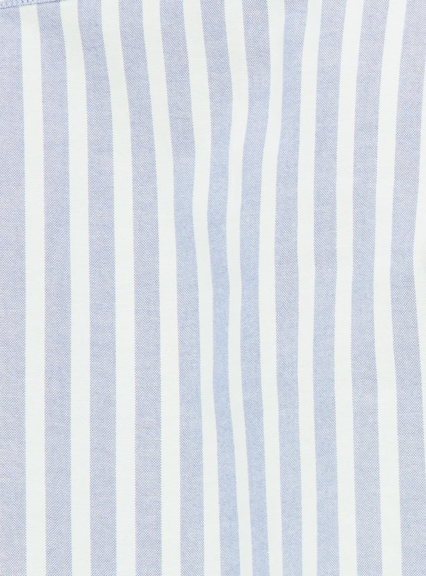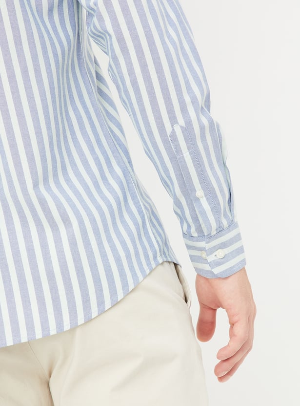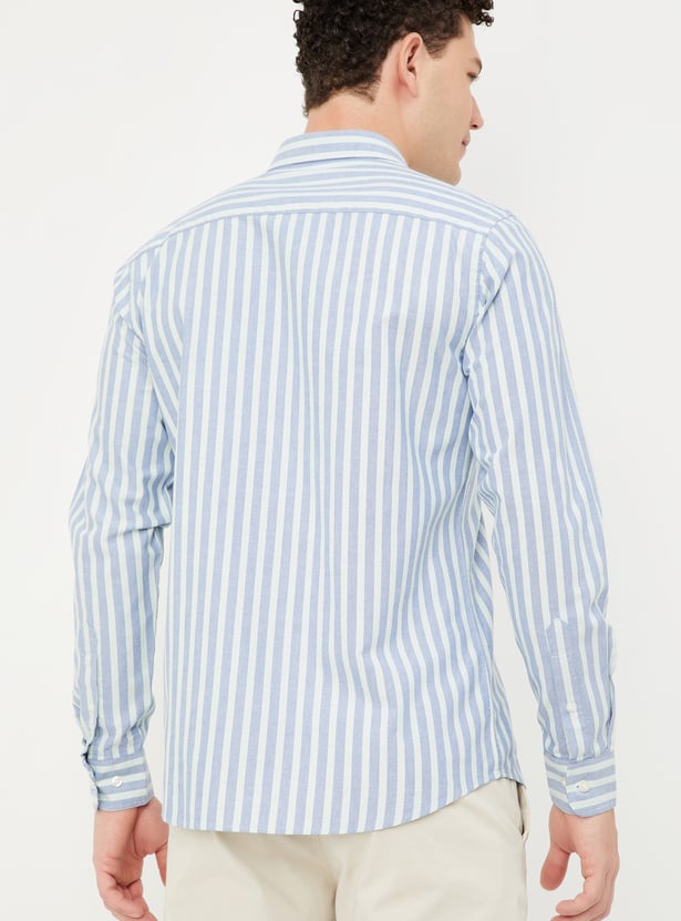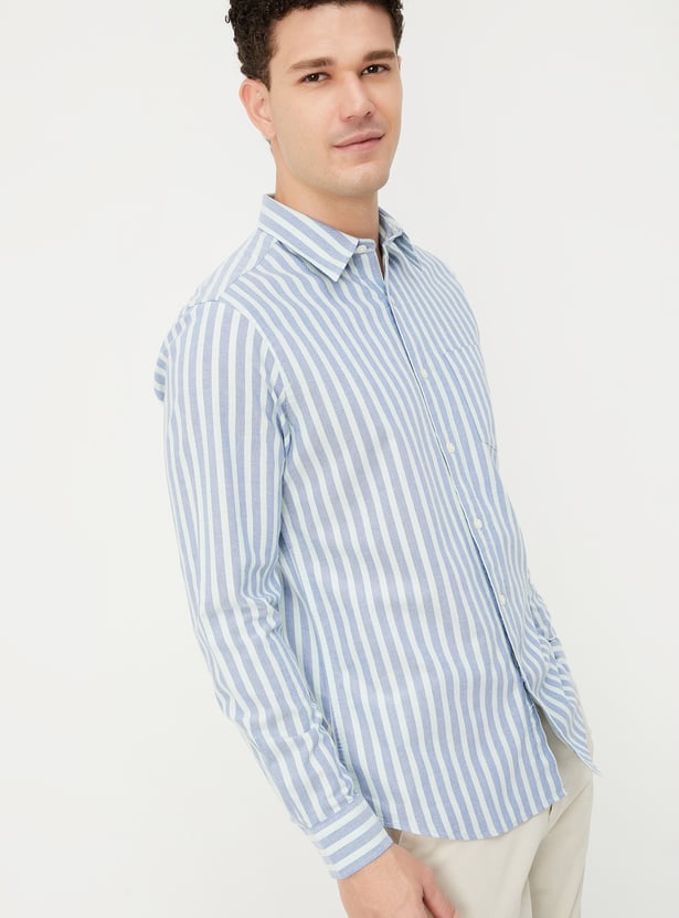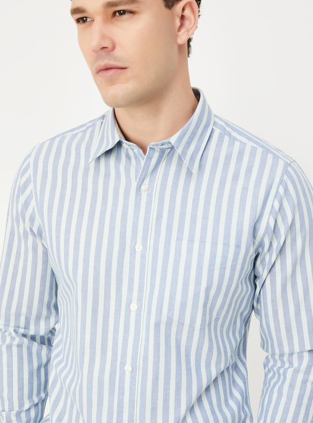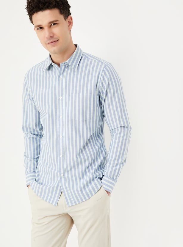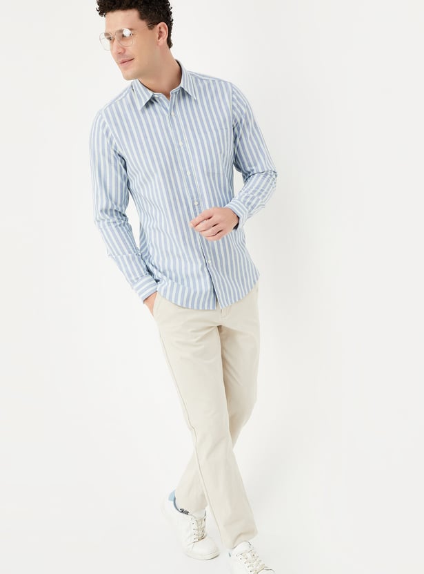 This striped slim fit shirt features a sleek spread collar, button placket, and full sleeves with button cuffs, offering a sharp, tailored look. The subtle stripes add a touch of modern sophistication.