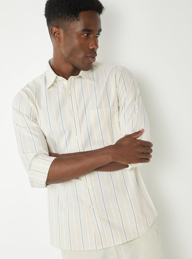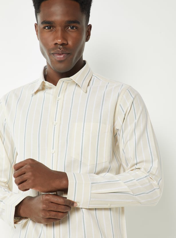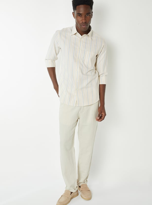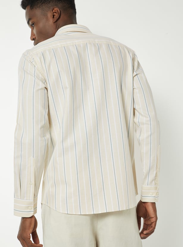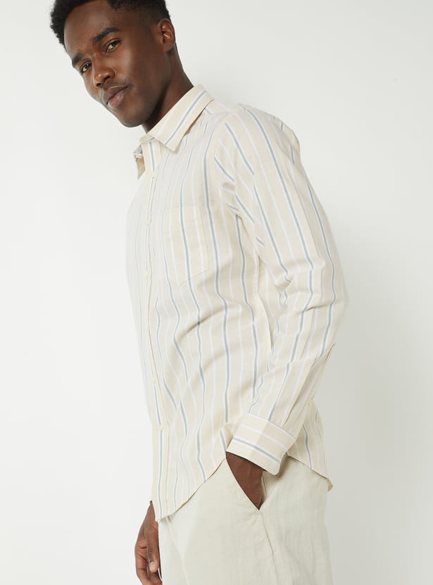 Elevate your casual style with this striped slim-fit shirt, featuring a button placket, spread collar, patch pocket, and full sleeves with button cuffs. A perfect combination of sleek design and comfort, ideal for both relaxed and semiformal occasions.