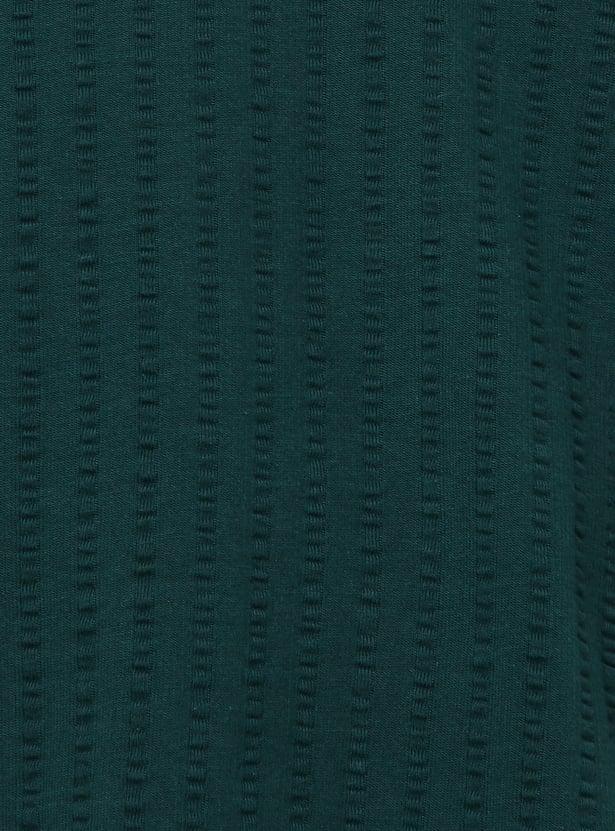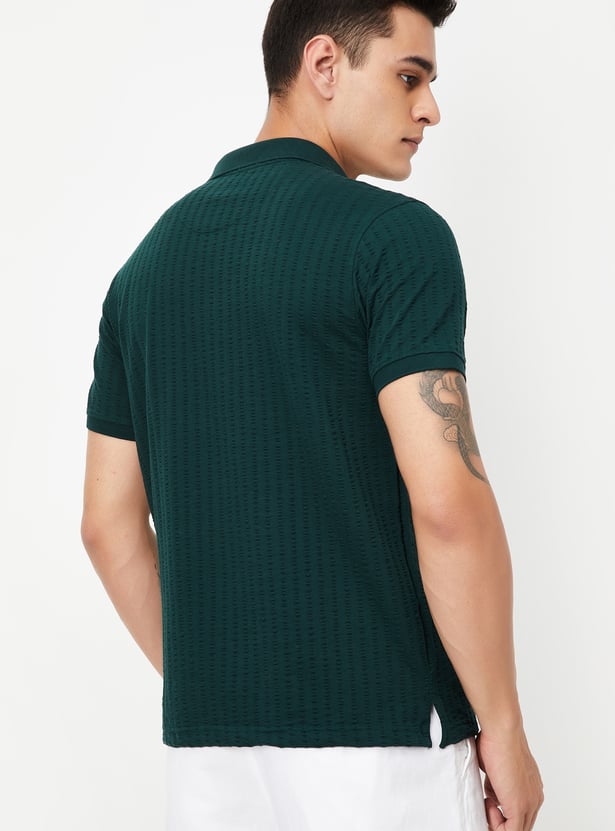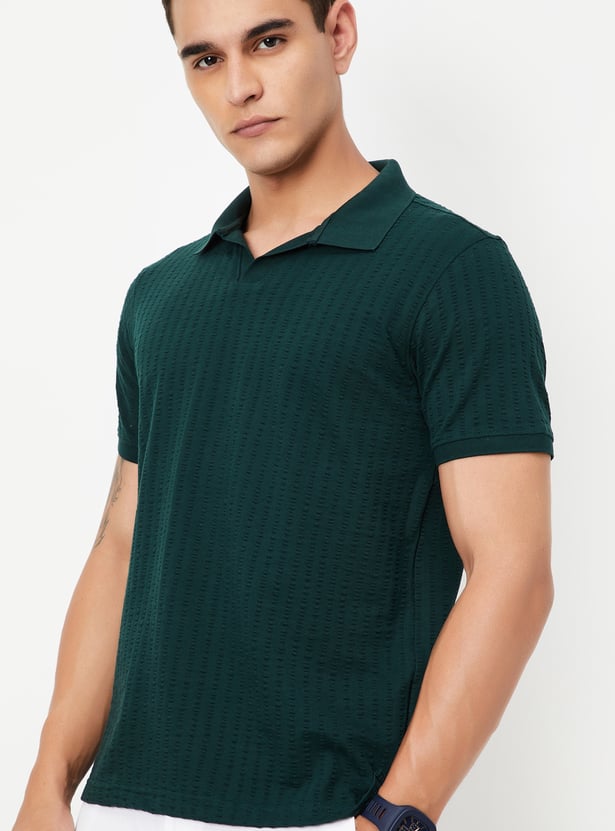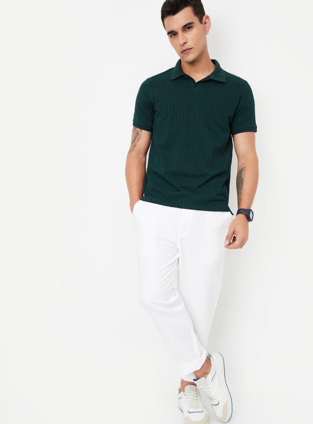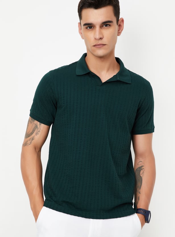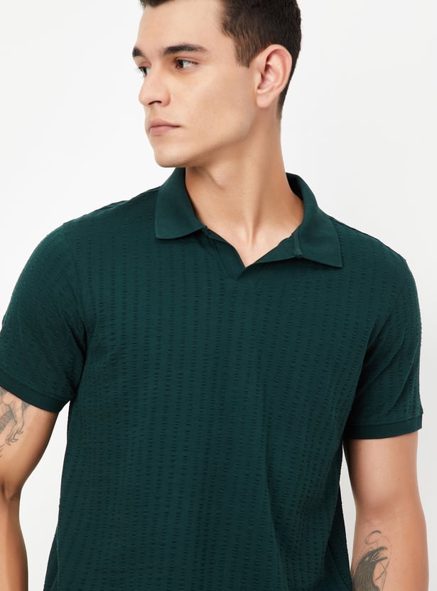 Elevate your casual look with this textured t-shirt, featuring a stylish Johnny collar and half sleeves. The knit fabric provides both comfort and a modern twist on the classic polo design.