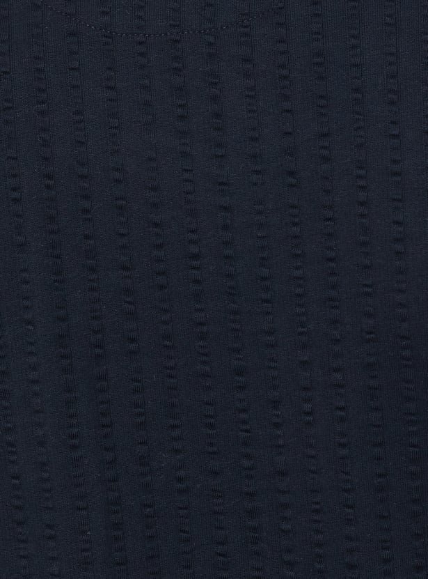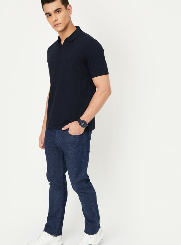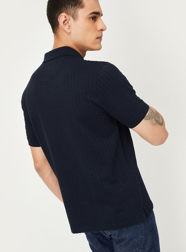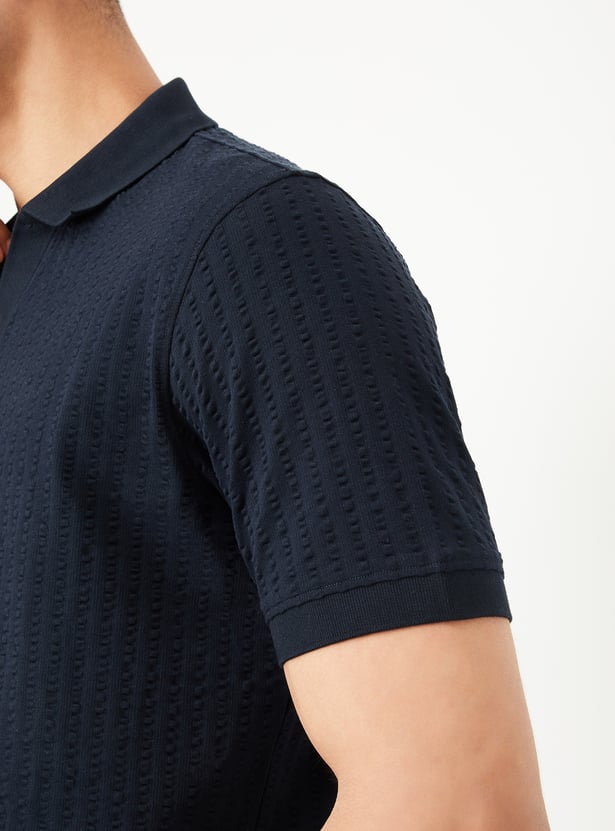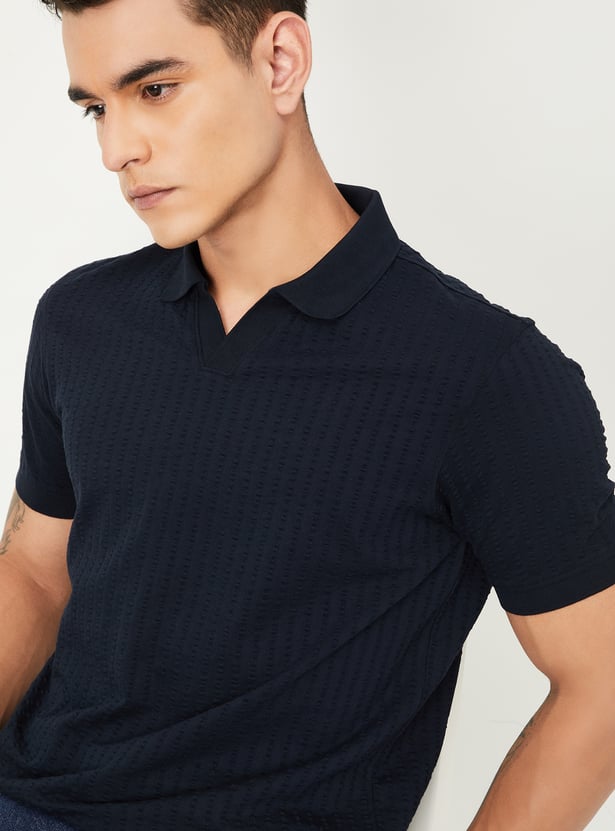 Elevate your casual look with this textured t-shirt, featuring a stylish Johnny collar and half sleeves. The knit fabric provides both comfort and a modern twist on the classic polo design.