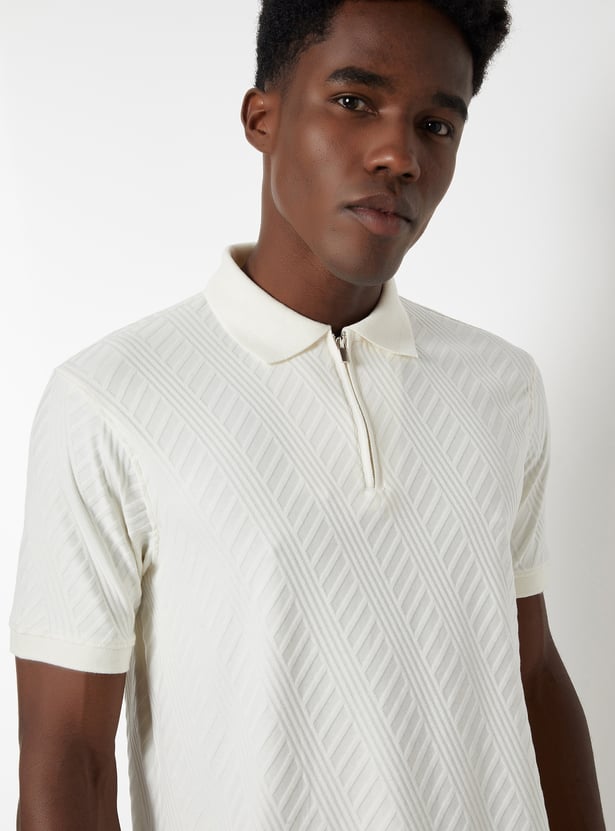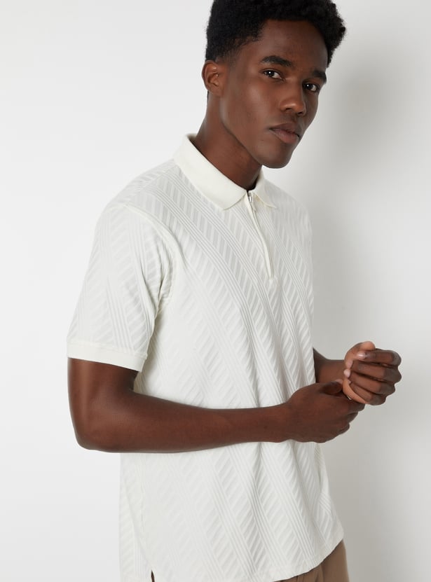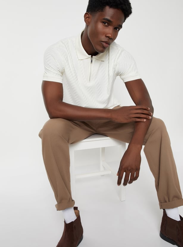 Add a modern twist to a classic look with this textured regular fit polo T-shirt, featuring a polo collar, half sleeves, and a sleek zip closure. The regular fit ensures all-day comfort, while the zip detail adds a contemporary edge.
