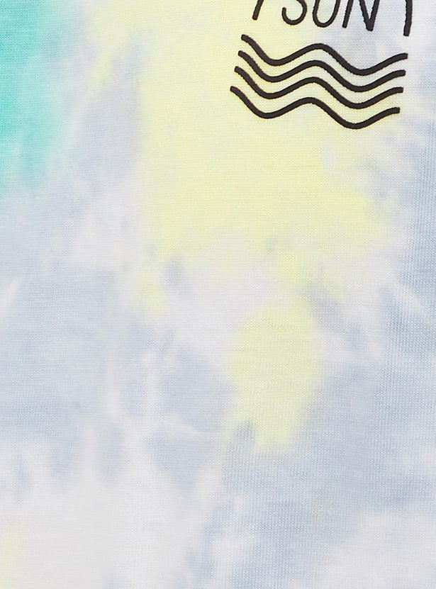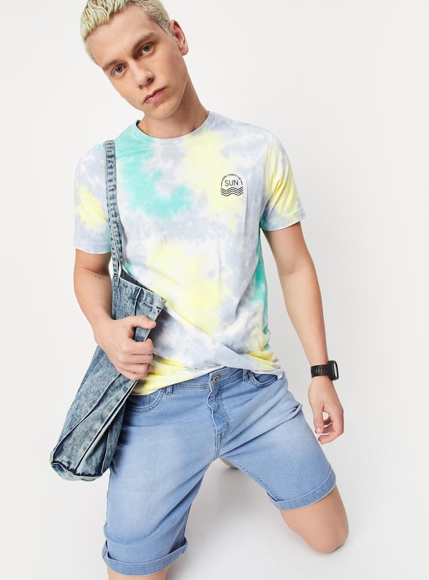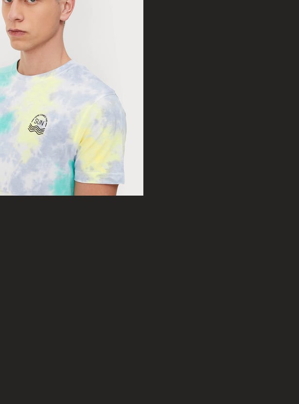 Spice your summer wardrobe with this T-shirt with tie and dye patterns. It is styled with a crew neck, short sleeves, and a slim-fit profile. Complete the look by styling this tee with denim shorts and sneakers.