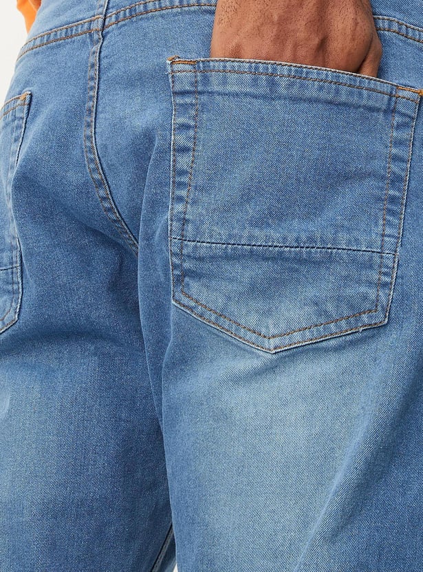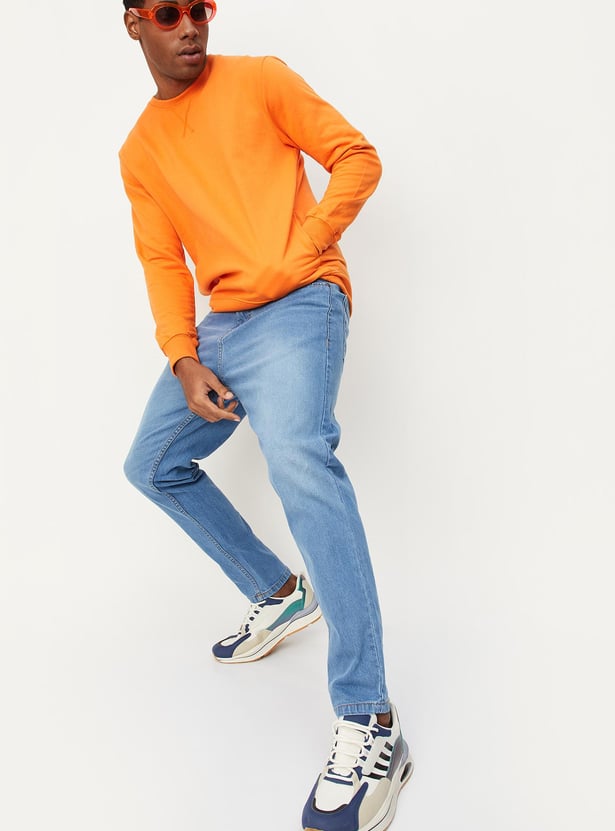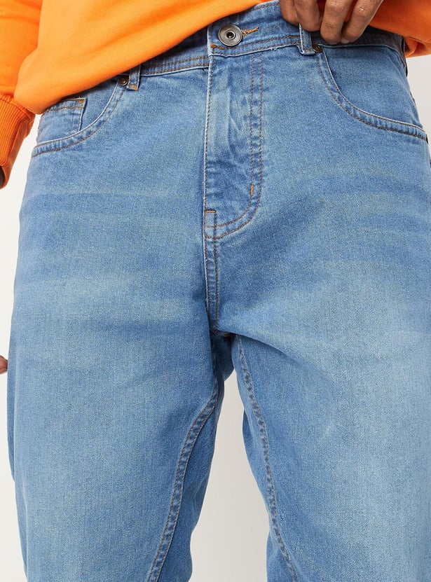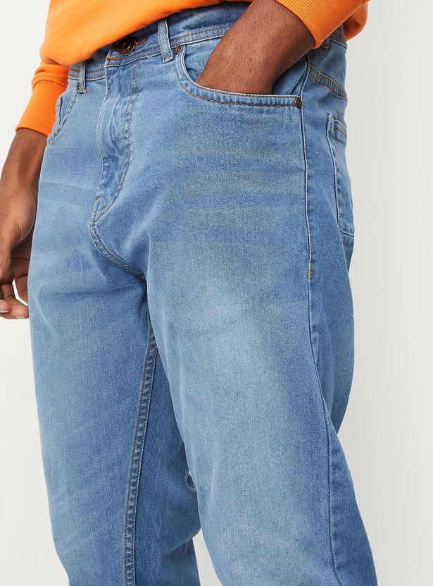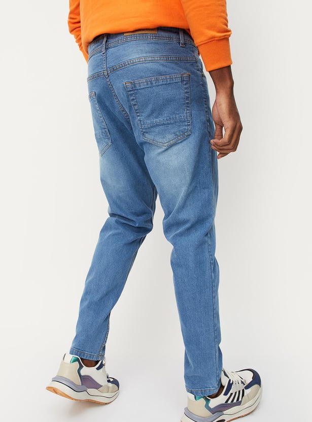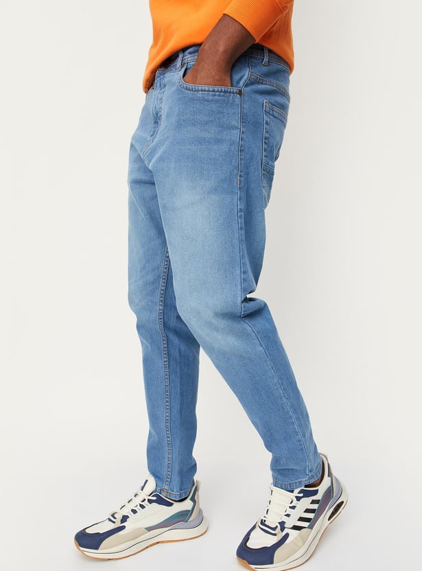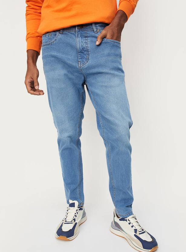 Up your everyday style with this pair of jeans in a washed finish. It boasts a carrot-fit profile, belt loop waist, 5 pockets, and whisker details. Style this pair with a tee and sneakers to ace the look.