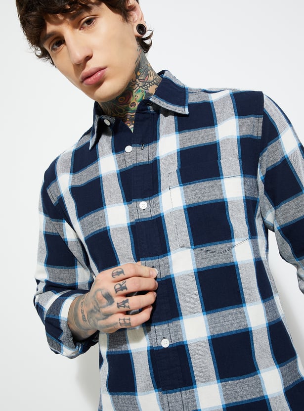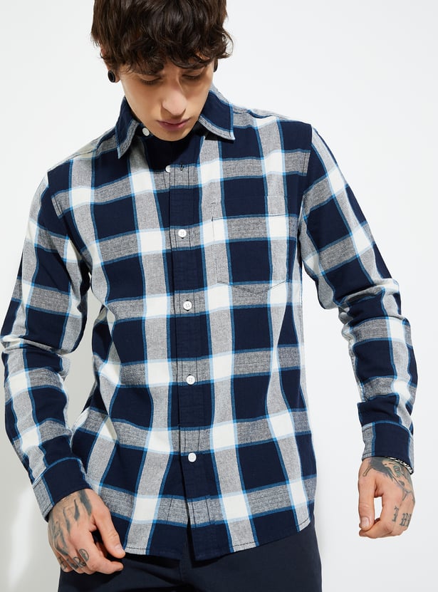 Stay timeless with this checked regular fit shirt, featuring a spread collar, button placket, and full sleeves with button cuffs. A functional patch pocket adds a practical touch to its classic design.