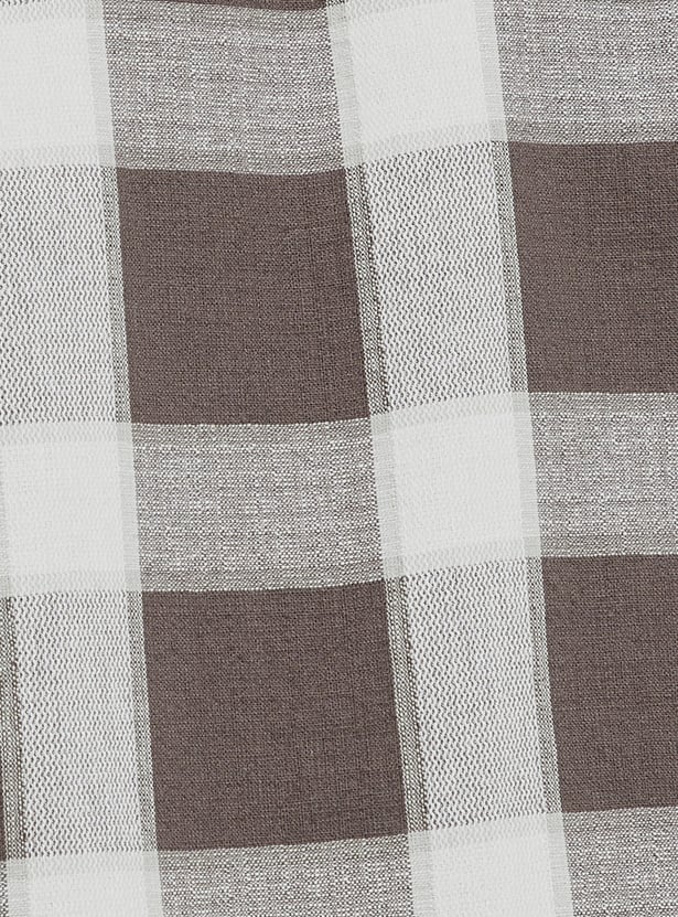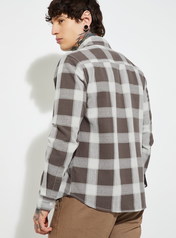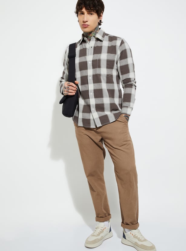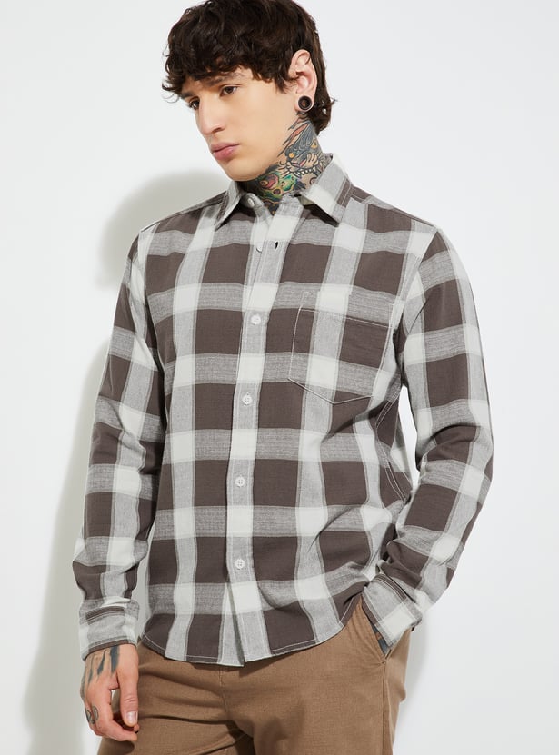 Stay timeless with this checked regular fit shirt, featuring a spread collar, button placket, and full sleeves with button cuffs. A functional patch pocket adds a practical touch to its classic design.