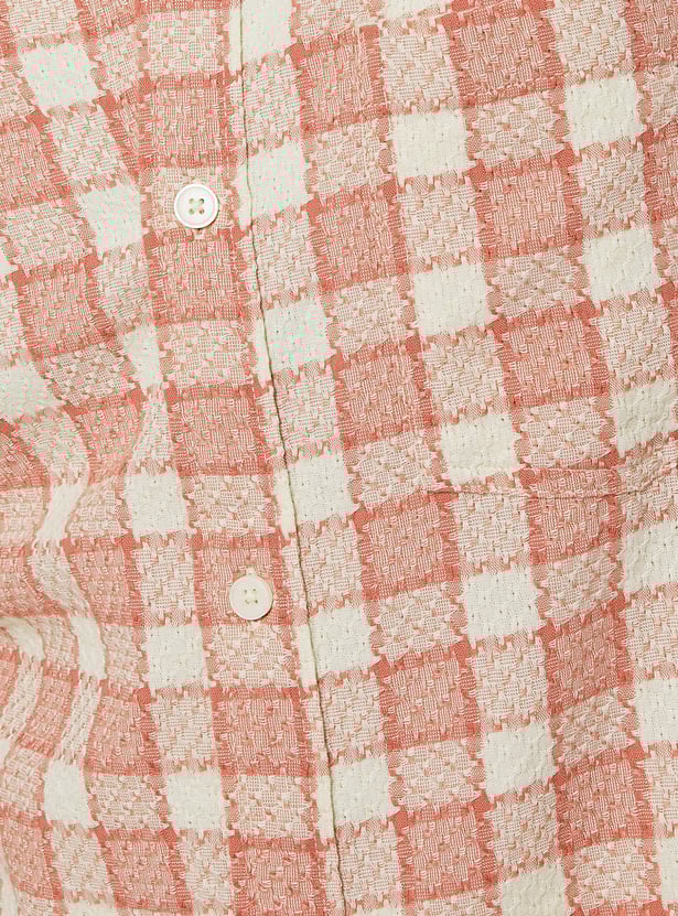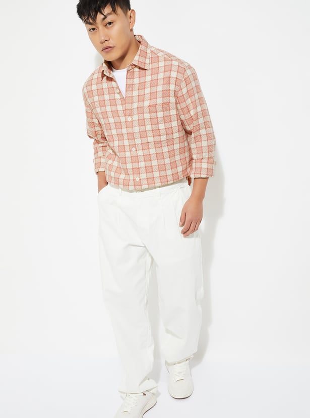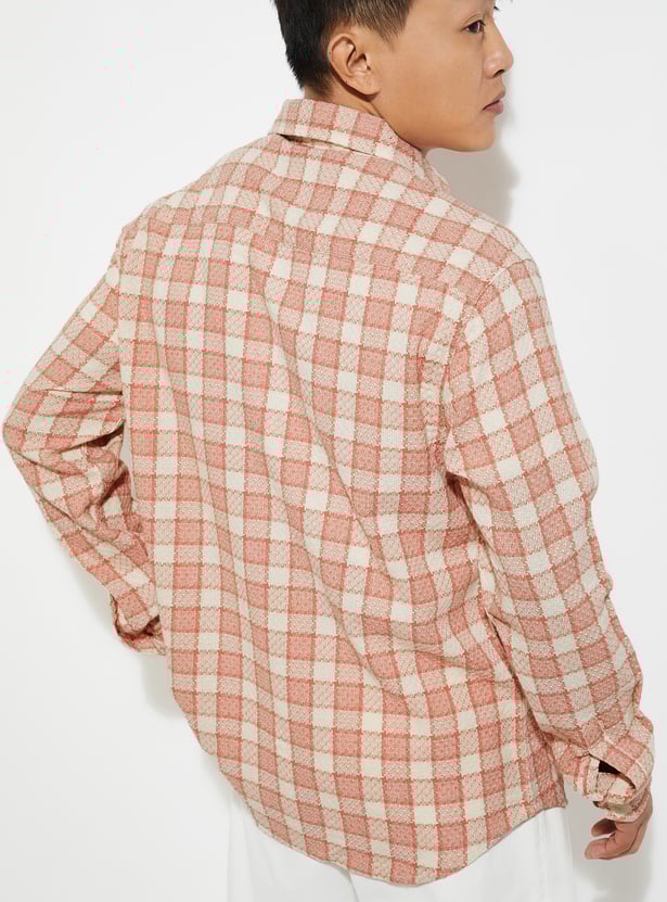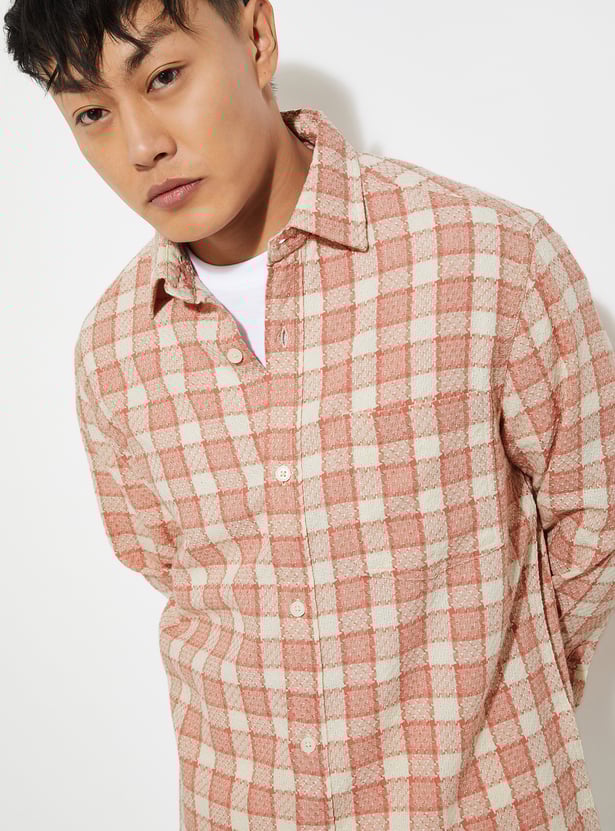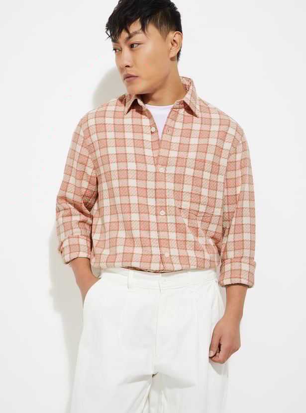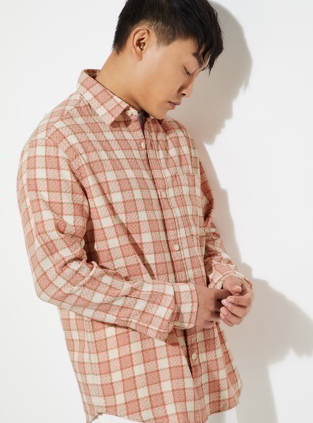 Add a classic touch to your casual wardrobe with this checked shirt. Designed with a spread collar and full sleeves with buttoned cuffs, it features a checked pattern, a patch pocket on the chest, and a curved hem for a polished finish.