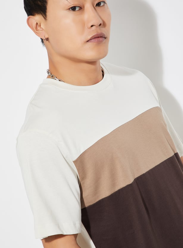 Add a pop of contrast to your casual wear with this colourblock regular fit T-shirt, featuring a crew neck and half sleeves. The bold design and comfortable fit make it a go-to choice for everyday style.