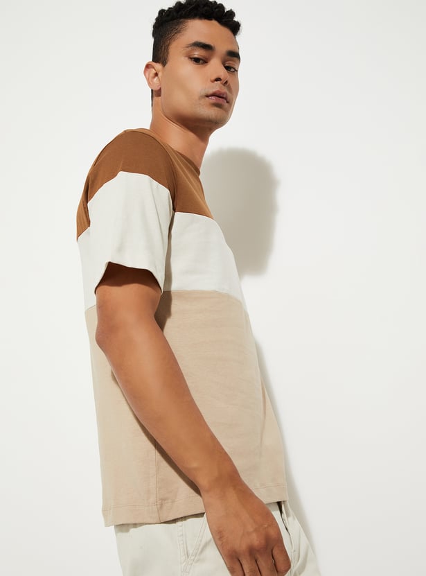 This colourblocked T-shirt brings a fresh update to casual dressing. It features a classic crew neck and half sleeves, offering a comfortable fit with a modern, sporty edge.