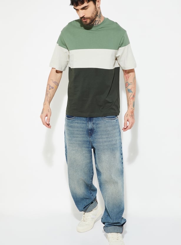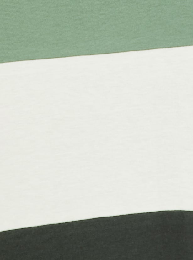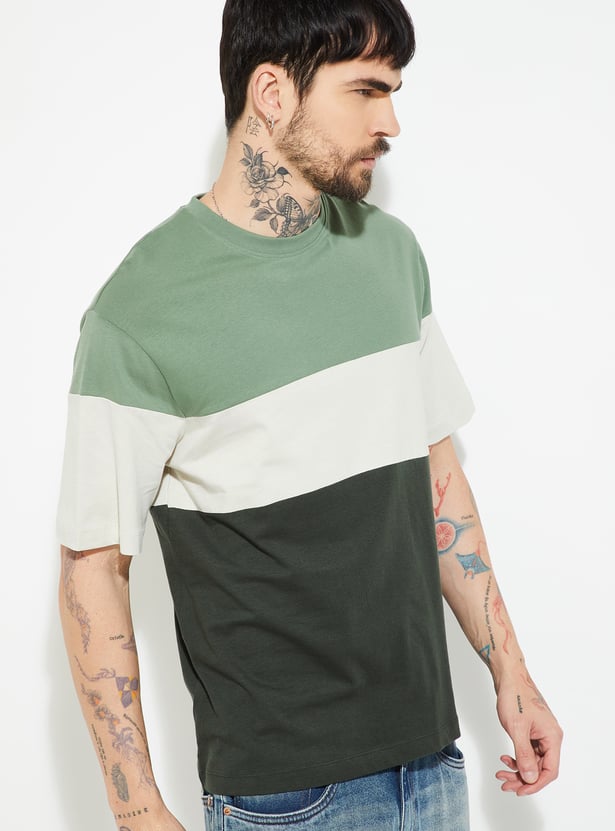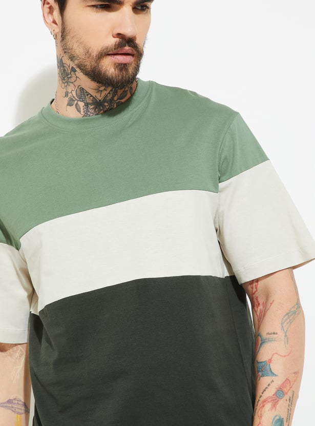 This colourblocked T-shirt brings a fresh update to casual dressing. It features a classic crew neck and half sleeves, offering a comfortable fit with a modern, sporty edge.