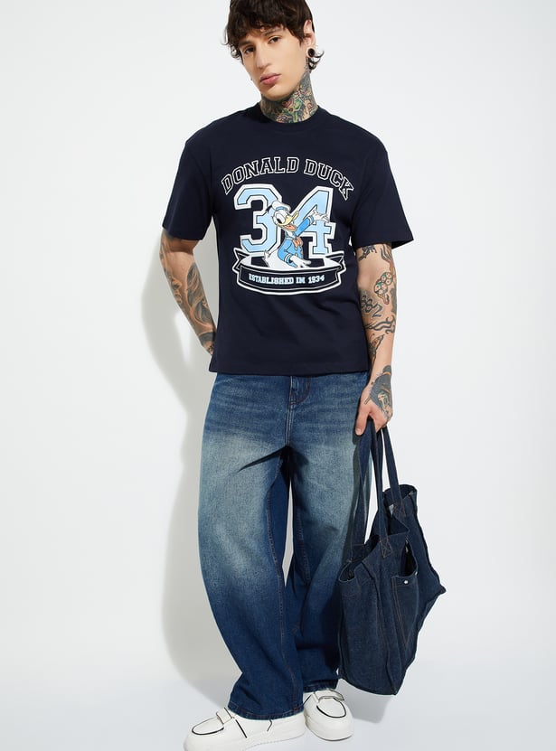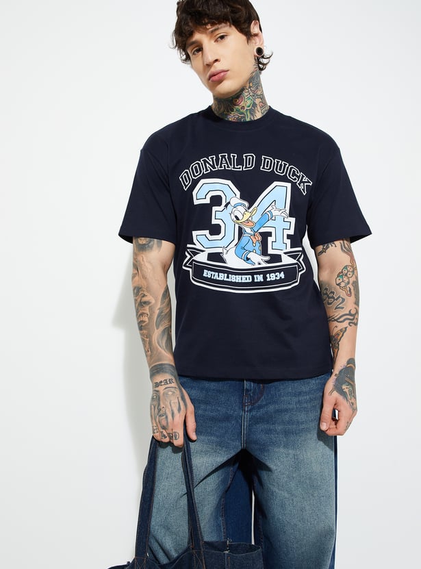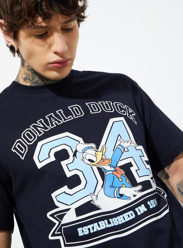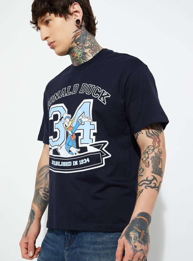 Add a dose of nostalgia to your casual wardrobe with this Donald Duck printed T-shirt. Featuring a crew neck and half sleeves, it offers comfort with a fun, animated twist. Perfect for Disney fans and everyday adventures alike.