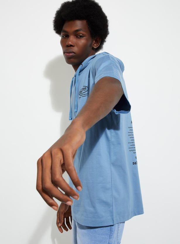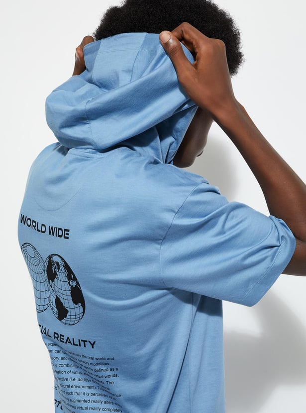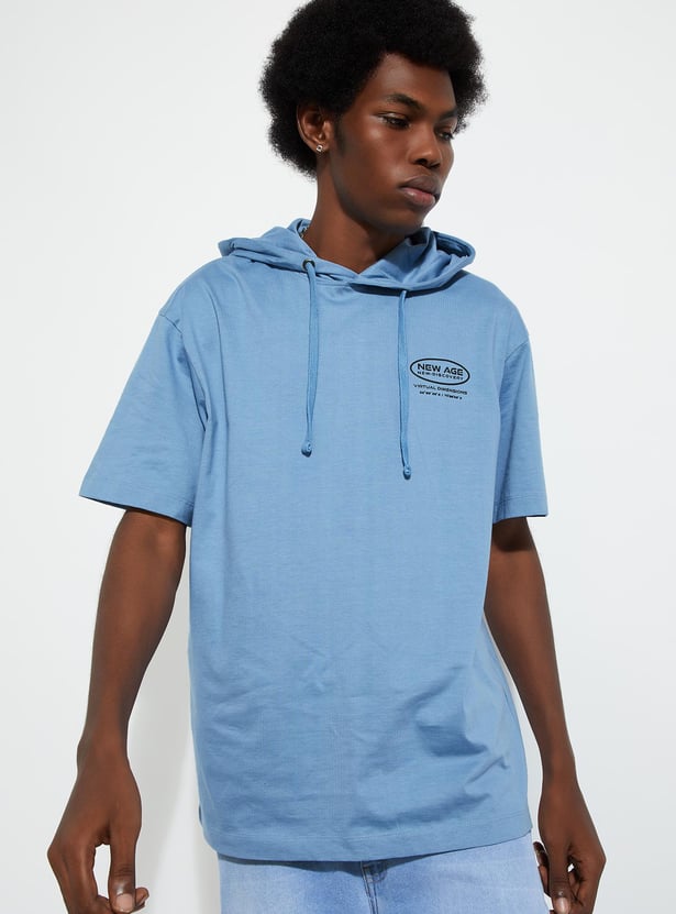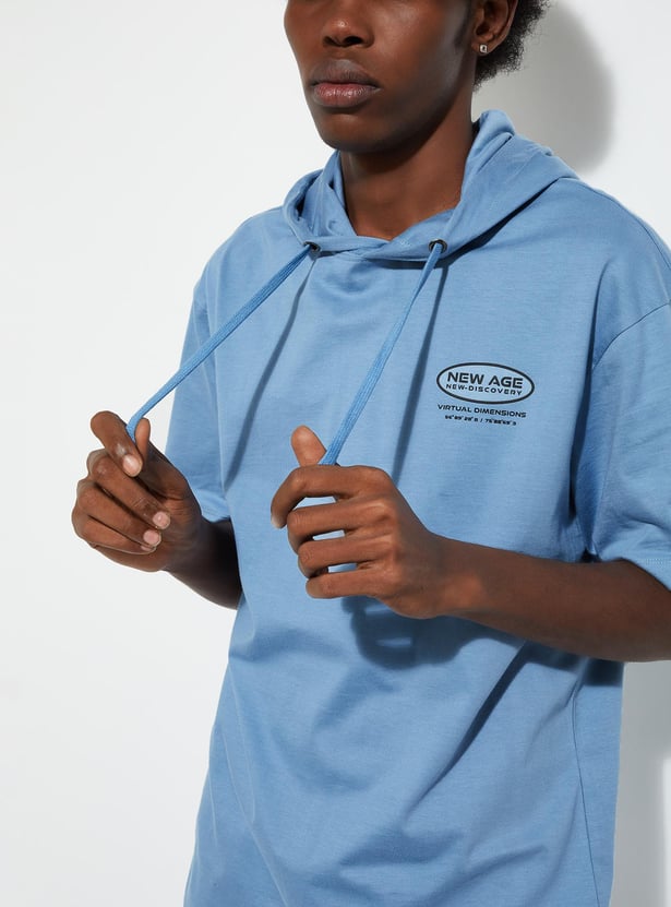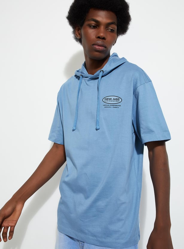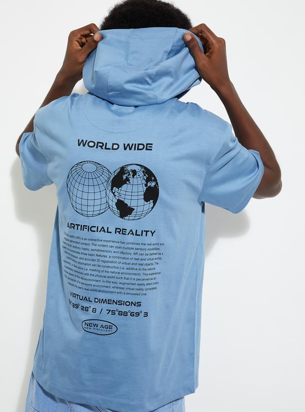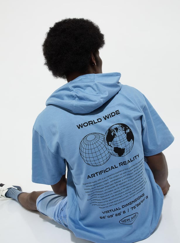 Revamp your wardrobe for the season with this oversized T-shirt. It has a hooded neck, short sleeves, a graphic print on the chest and back, and a relaxed fit profile.