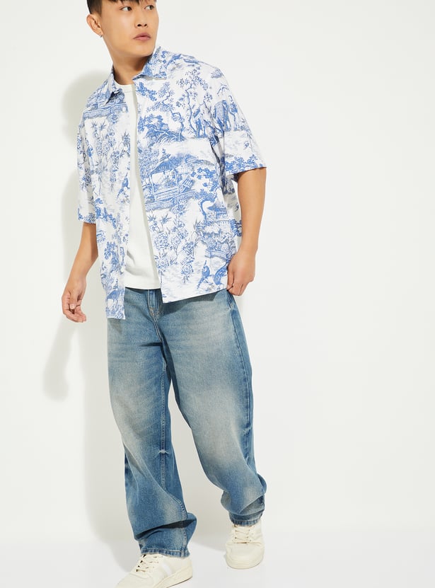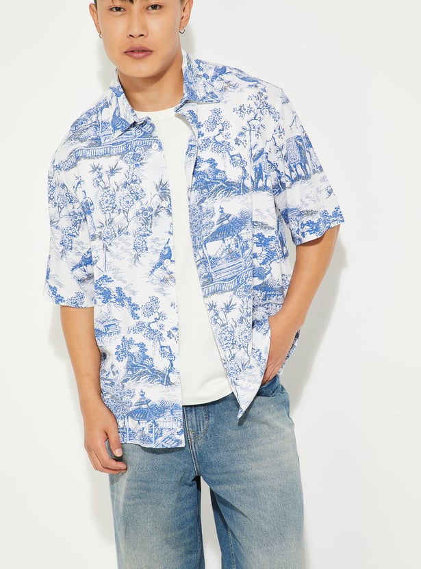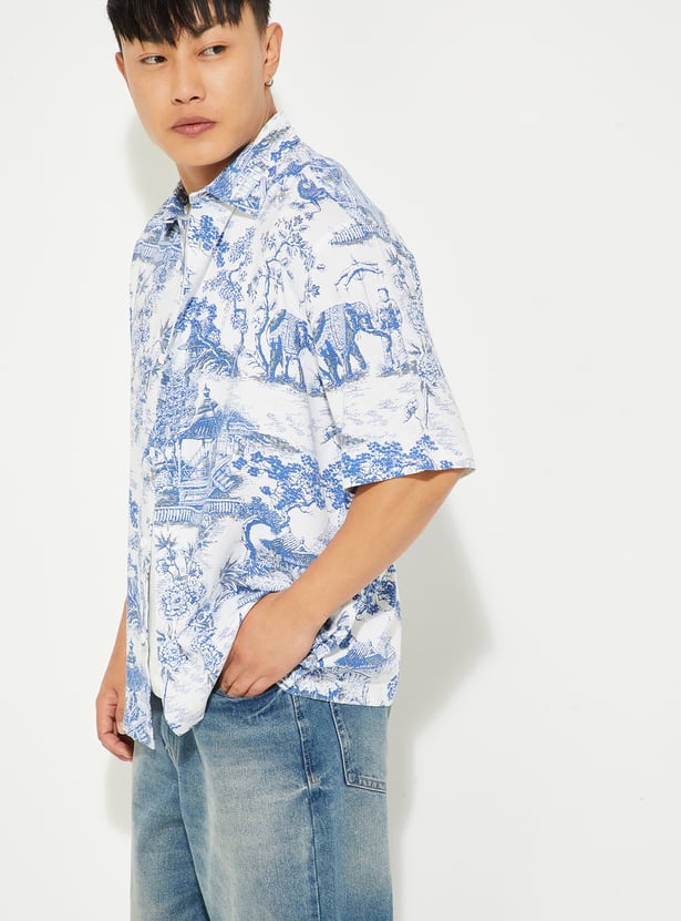Make a bold statement in this printed oversized shirt featuring a spread collar, half sleeves, and a classic button placket. Relaxed in fit yet stylish in design, it’s perfect for casual outings or weekend wear.