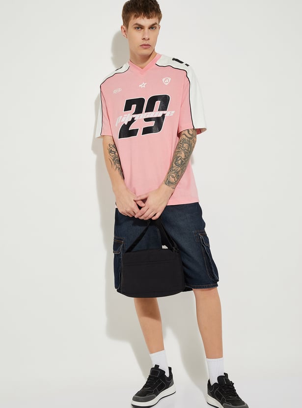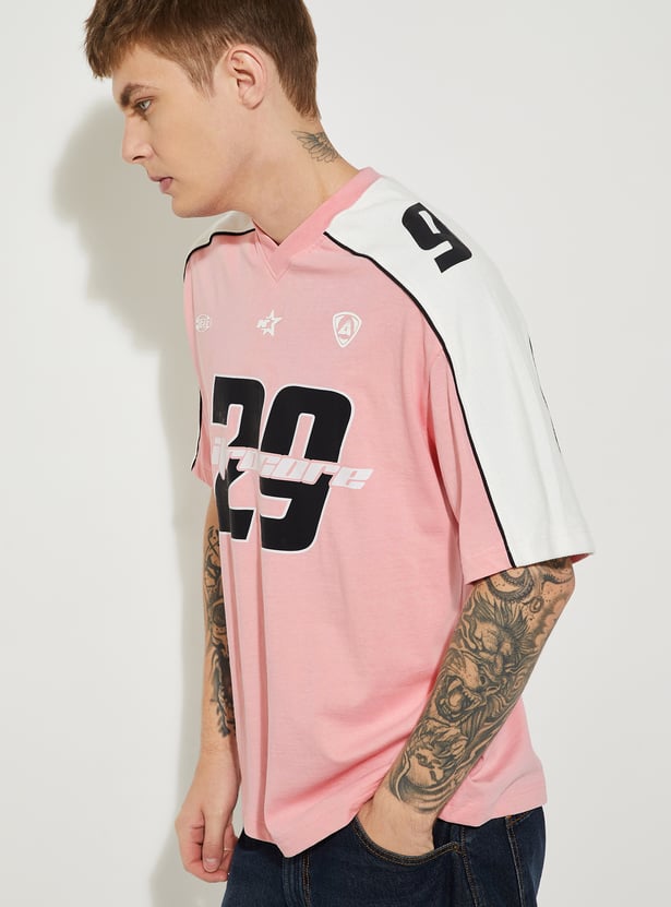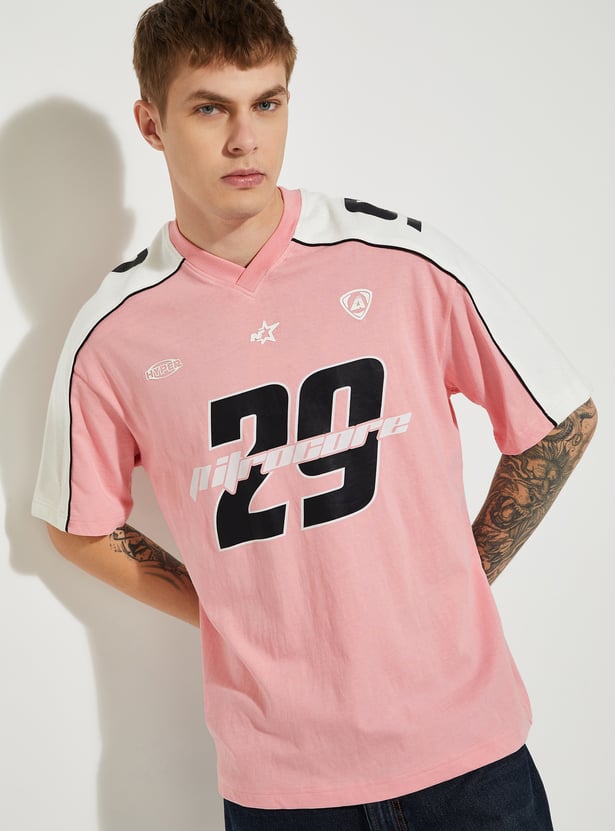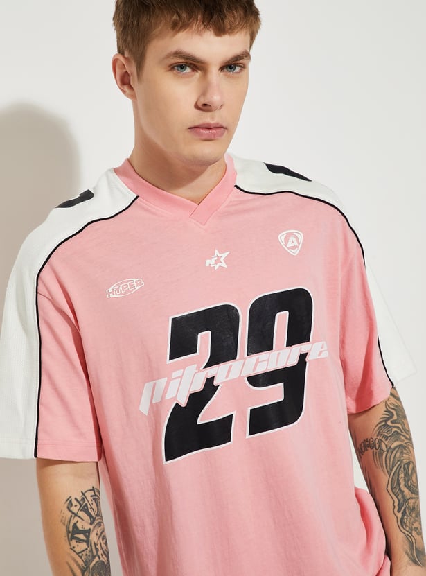 Keep it casual and trendy with this printed oversized t-shirt, designed for everyday comfort. Featuring a classic v-neck and half sleeves, it offers a relaxed fit with numeric prints, making it a versatile staple for your wardrobe.