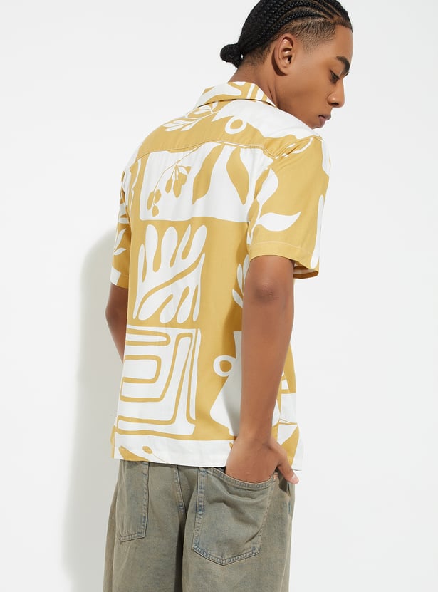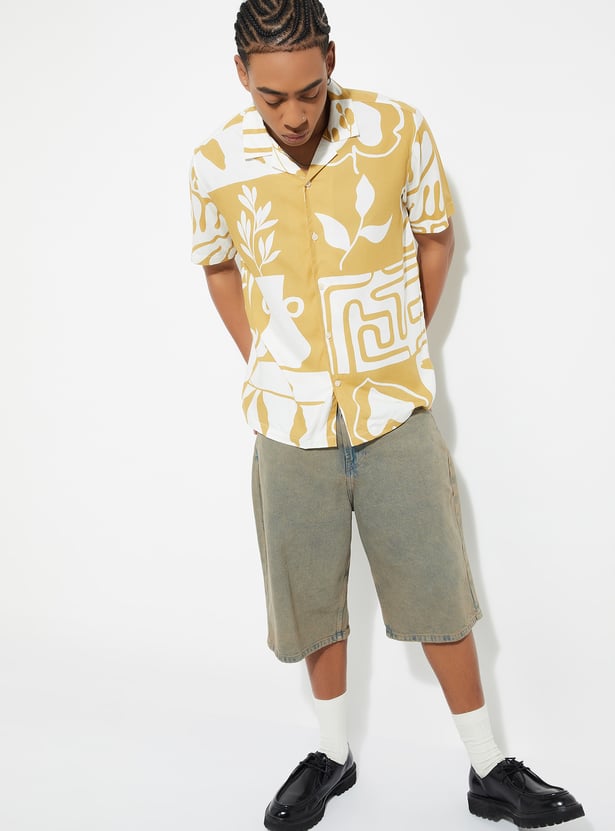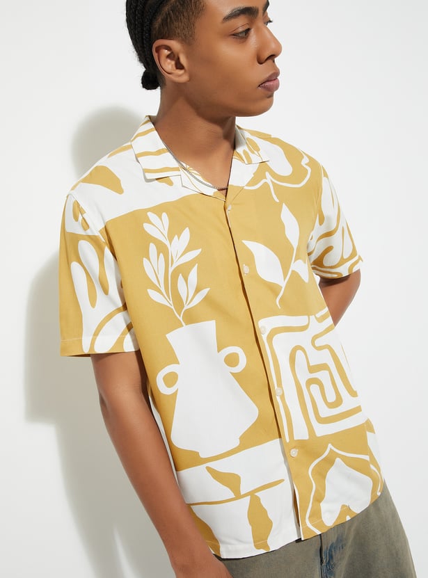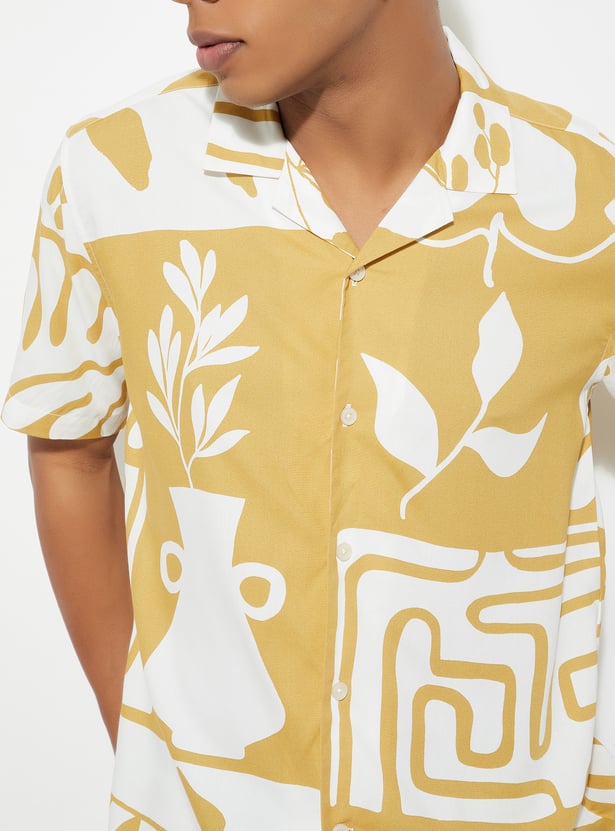 This printed regular fit shirt features a stylish resort collar and a button placket for a classic touch. With its half sleeves, it's perfect for warmer days, offering comfort and breathability. The unique print adds a fun, casual vibe, making it an ideal choice for both relaxed outings and casual events.