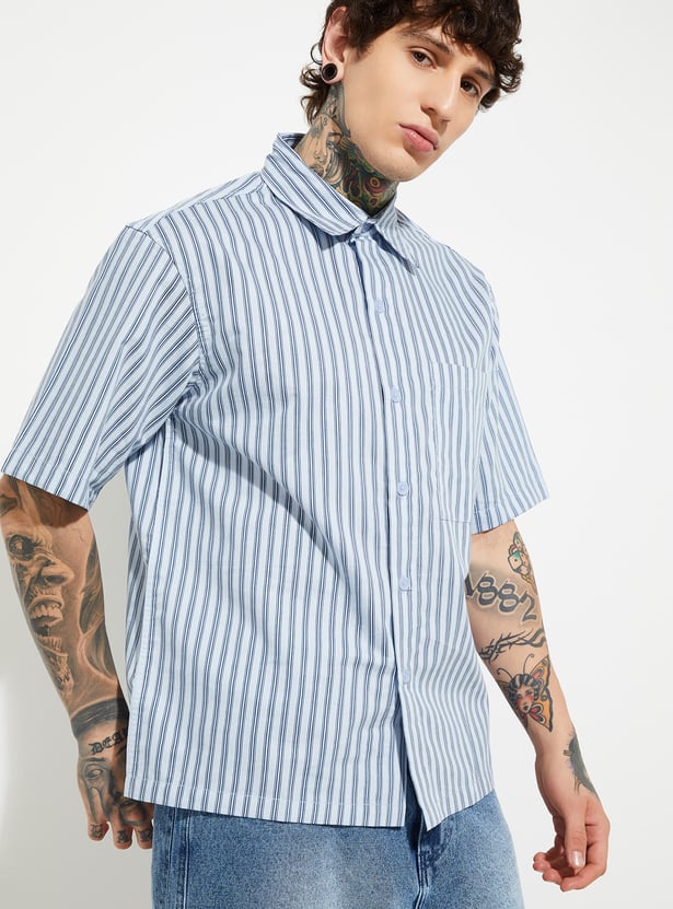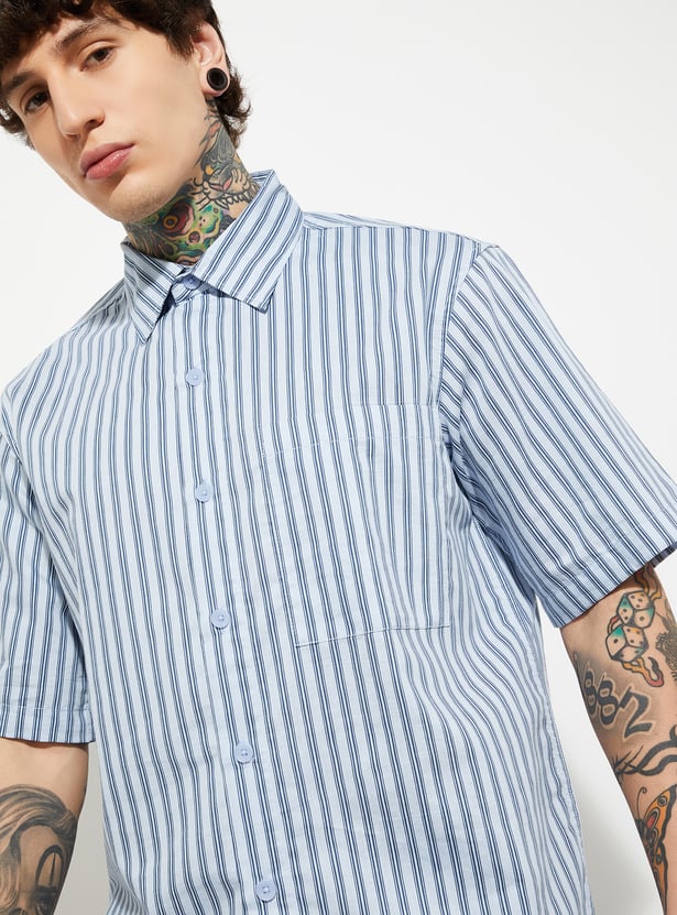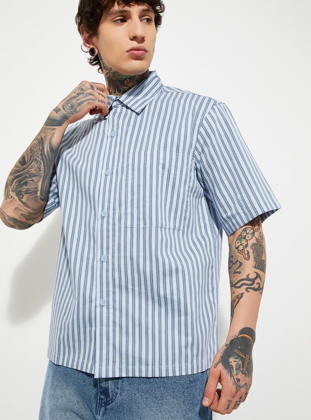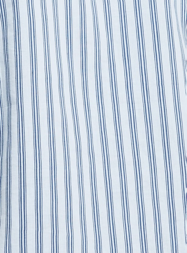 This striped relaxed fit shirt features a crisp spread collar, neat button placket, and half sleeves for easy, breathable wear. Finished with a handy patch pocket, it’s a versatile staple for casual comfort with a tailored touch.