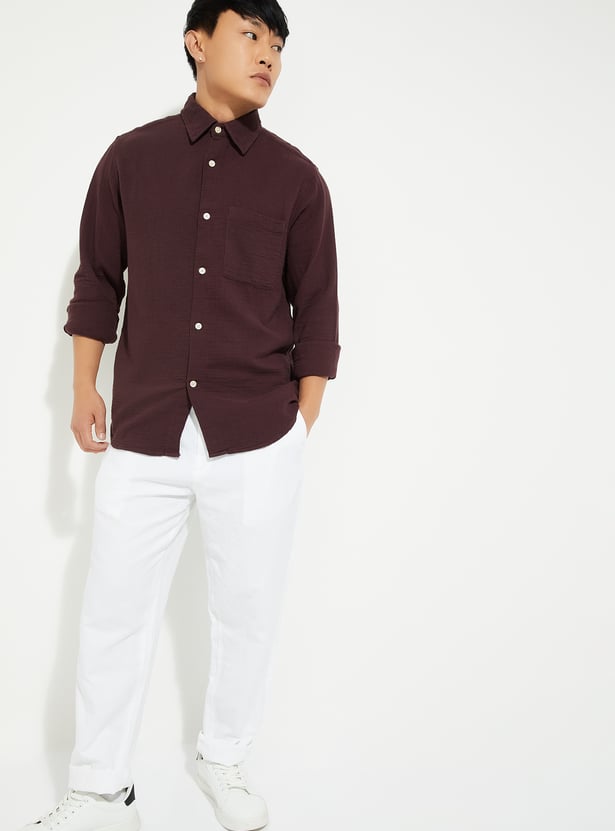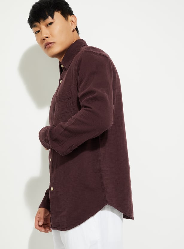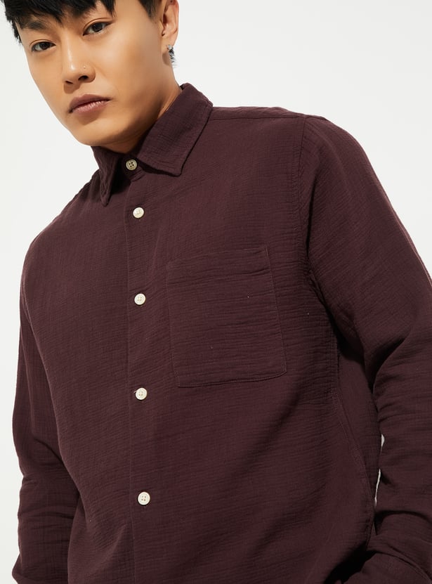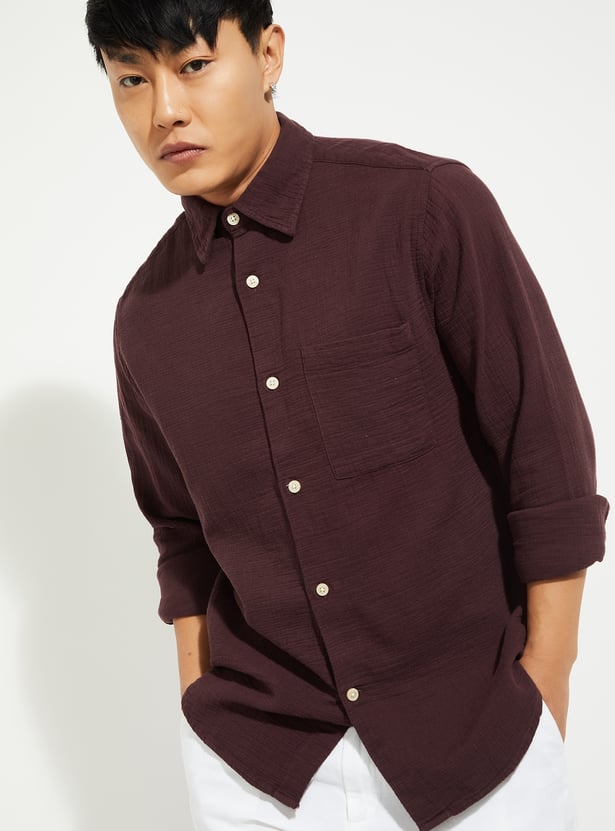 Smartly structured with subtle texture, this shirt features a spread collar, full sleeves with buttoned cuffs, and a classic button placket for a polished look. The patch pocket adds a touch of utility, while the breathable fabric ensures comfort from desk to dinner. A versatile staple for elevated everyday dressing.