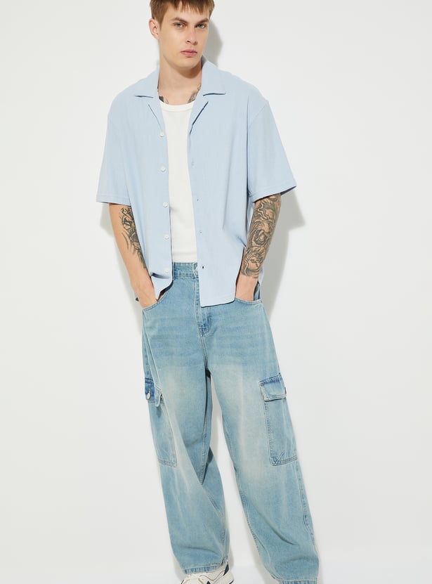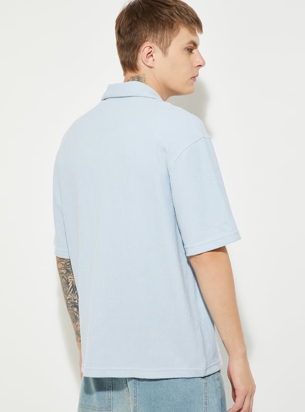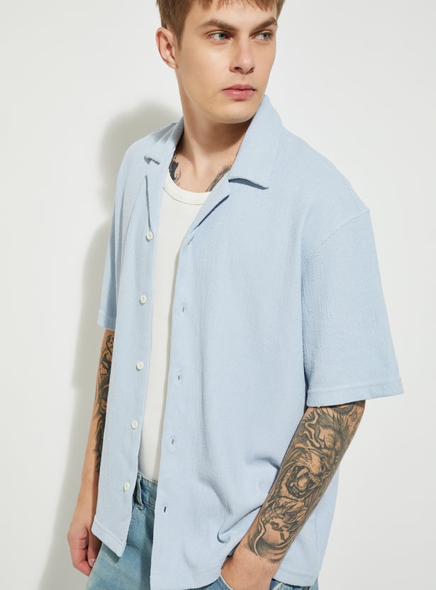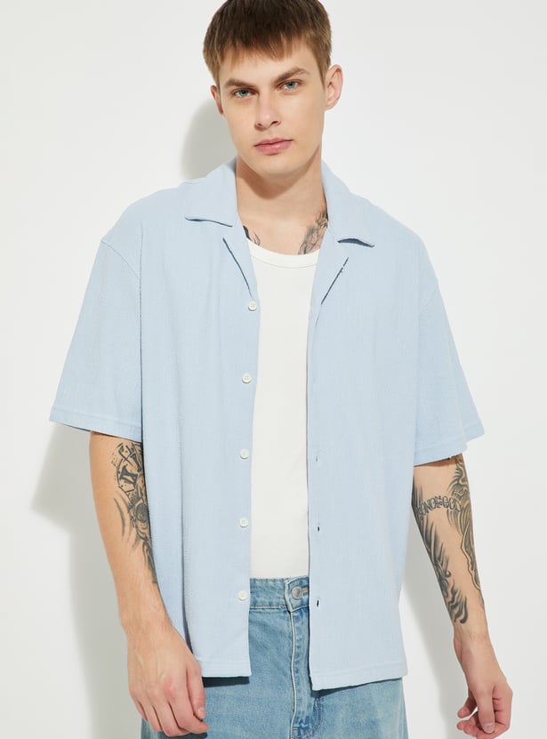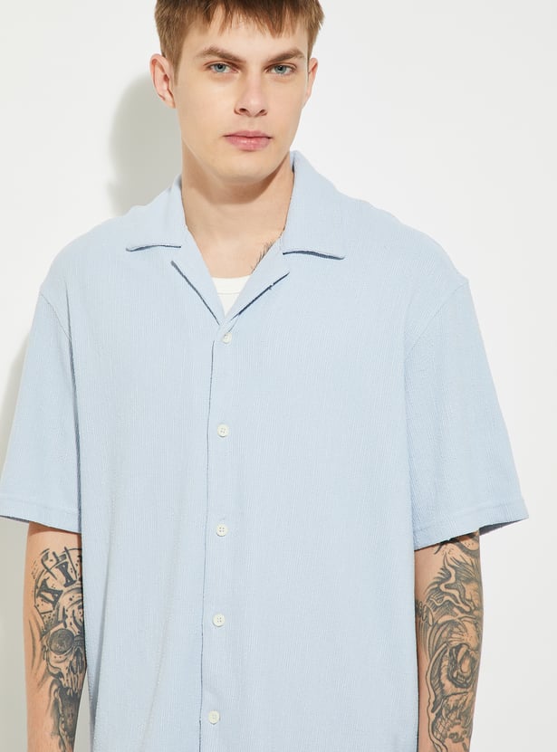 This textured regular fit shirt is designed with a resort collar, button-down front, and comfortable half sleeves. The relaxed detailing, and easy fit make it a versatile choice for everyday wear, travel days, and casual gatherings.