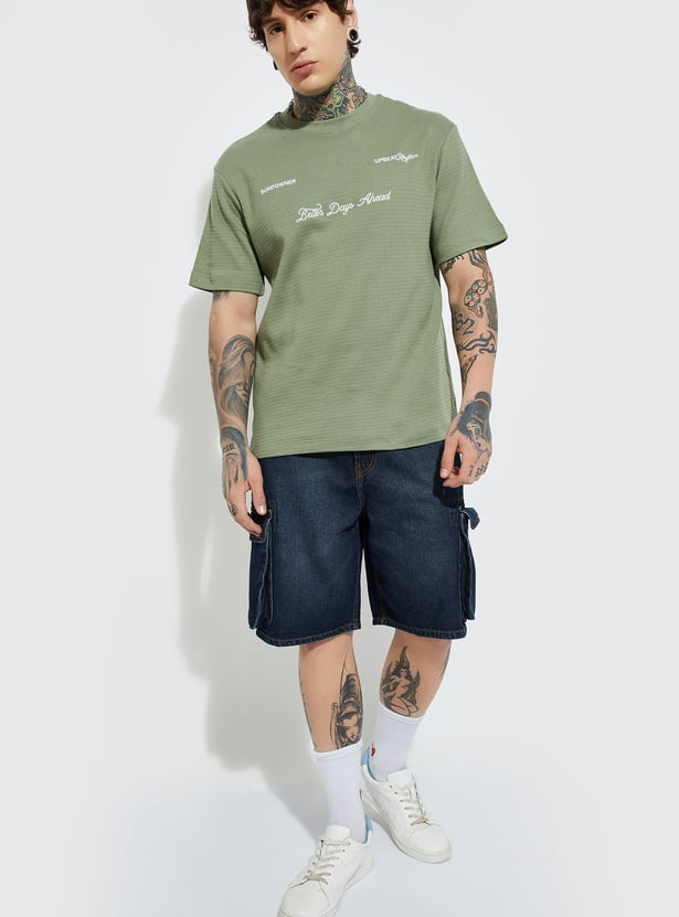 Stand out in effortless style with this textured T-shirt. Featuring a classic crew neck, embroidered detail, and half sleeves, it’s designed for everyday comfort with a touch of personality.