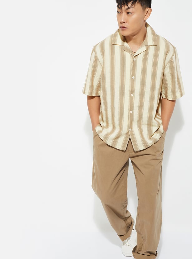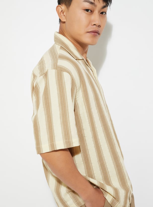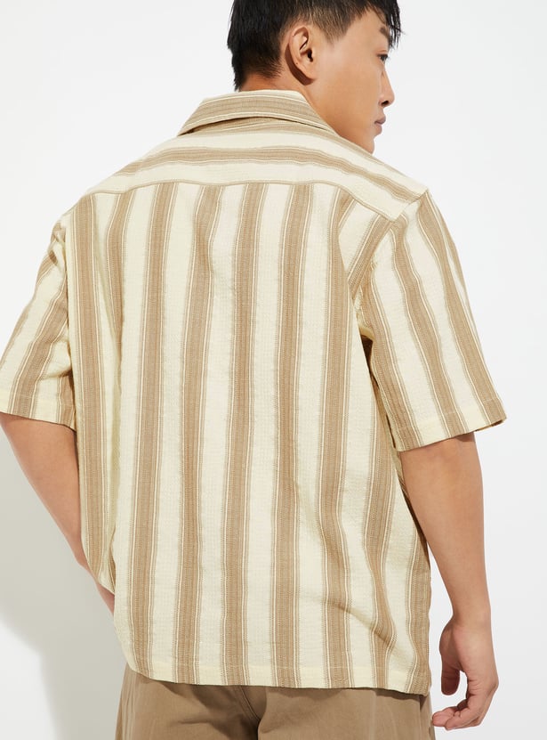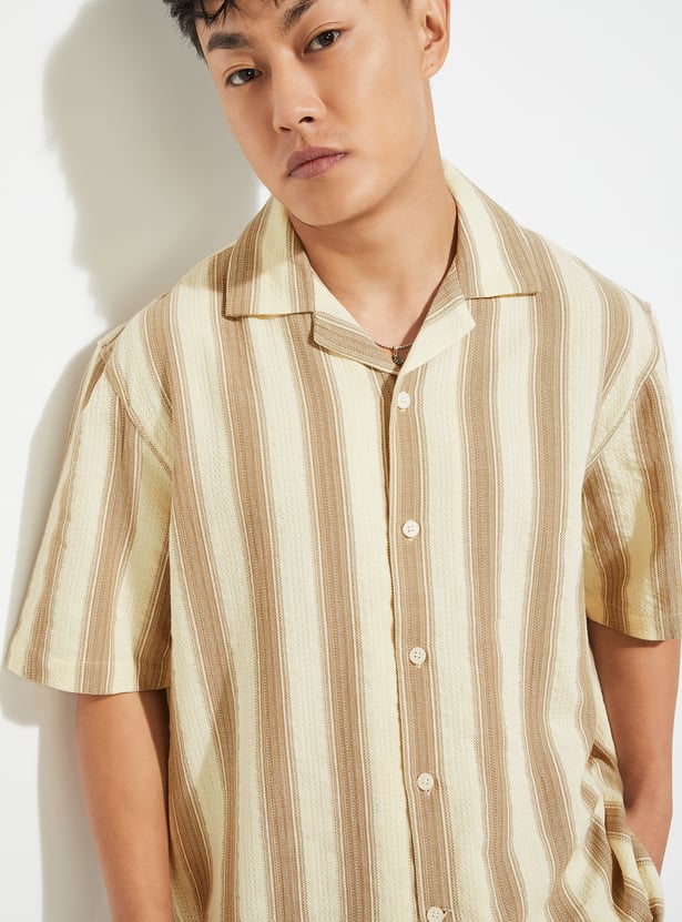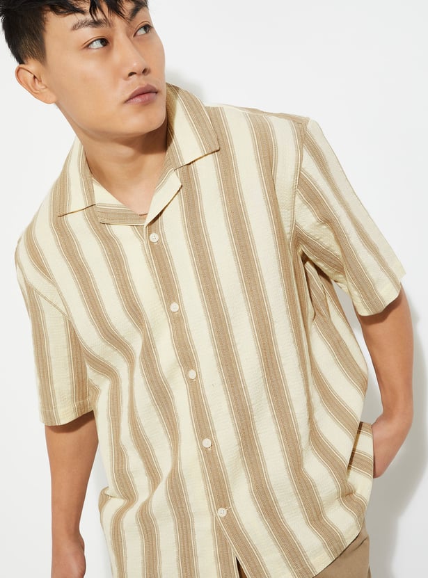 Add a relaxed vibe to your casual wardrobe with this shirt. Designed with a resort collar and half sleeves, it features a striped pattern for a classic look.