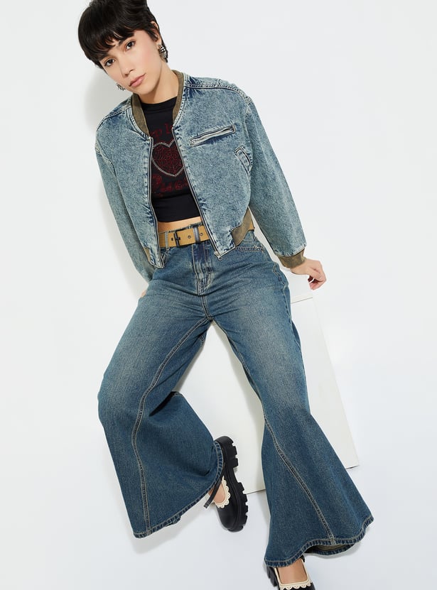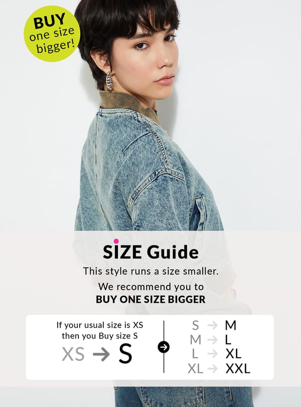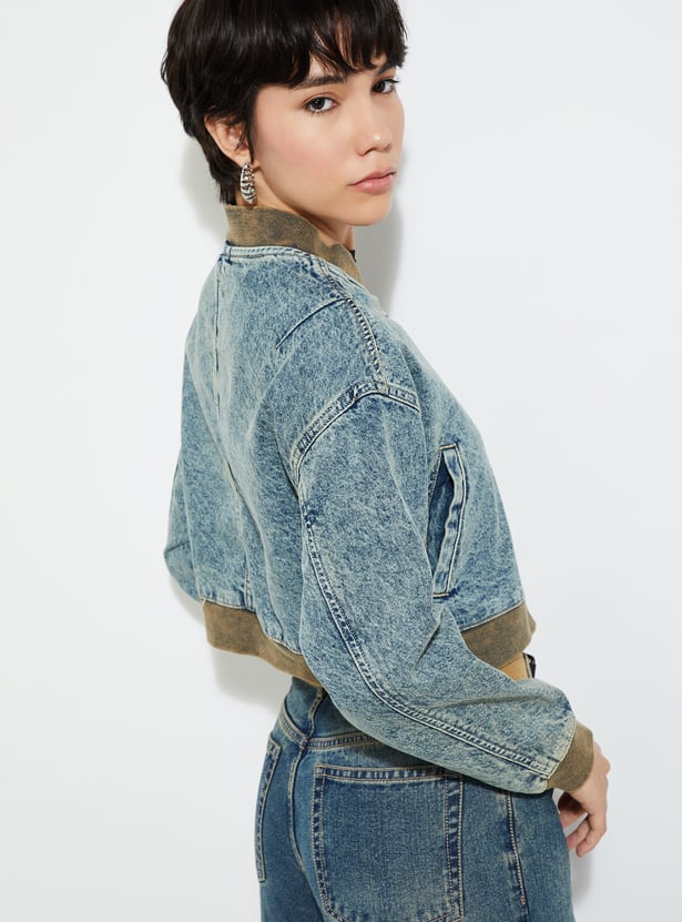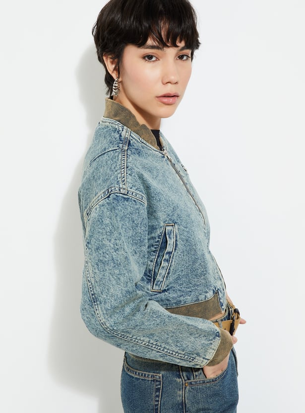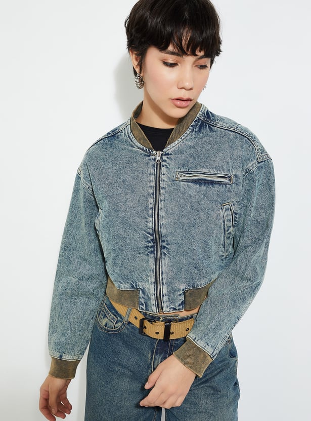 Slay your style with this denim jacket. It has a baseball collar, full sleeves, ribbed trim, and a zip front. The functional pockets add to the look.