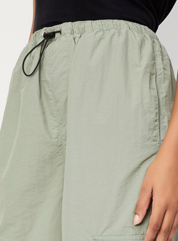 Make a chic statement in this pair of parachute trousers rendered in a solid tone. It features a drawstring waist, cargo pockets, and a drawcord hem.