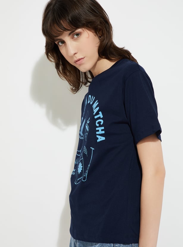 Level up your casual game with this t-shirt, featuring a bold graphic print that brings the perfect blend of fun and individuality. With half sleeves and a classic round neck, this piece delivers effortless comfort while keeping your streetwear look fresh and on point.