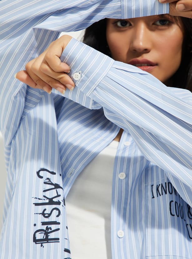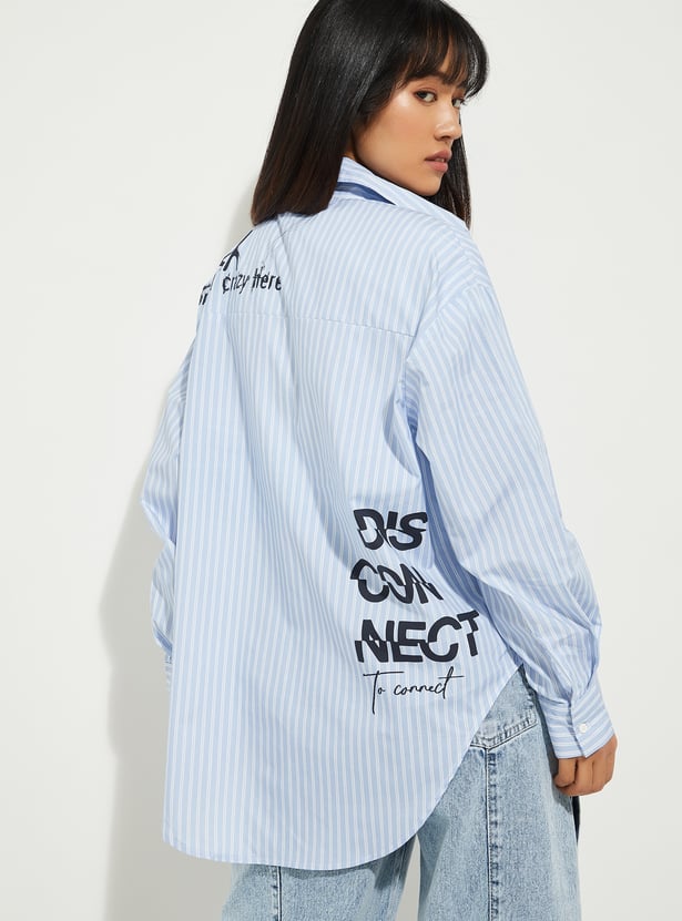 Ready to level up your style? This striped loose-fit shirt is the perfect blend of comfort and cool. Featuring a button placket, spread collar, back print, and full sleeves with button cuffs, it’s everything you need to stay stylish yet laid-back.