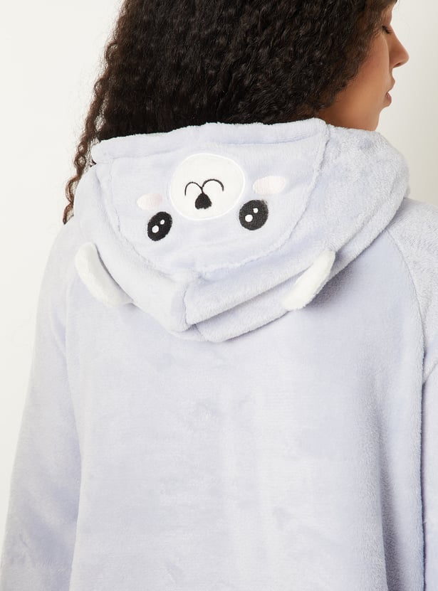 Stay cozy and cute with this applique sleepwear poncho, featuring a hooded design and a kangaroo pocket for added comfort and functionality. Soft and roomy, it’s perfect for lounging or bedtime.
