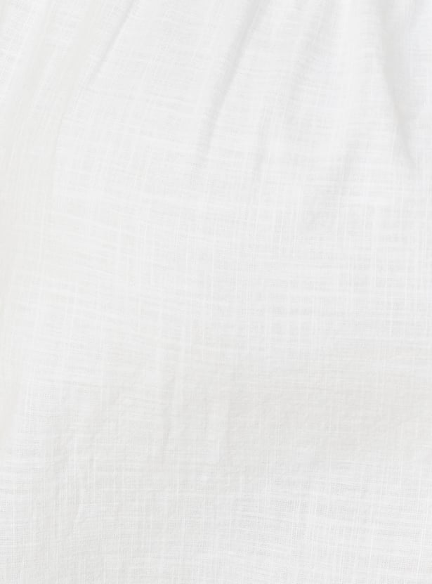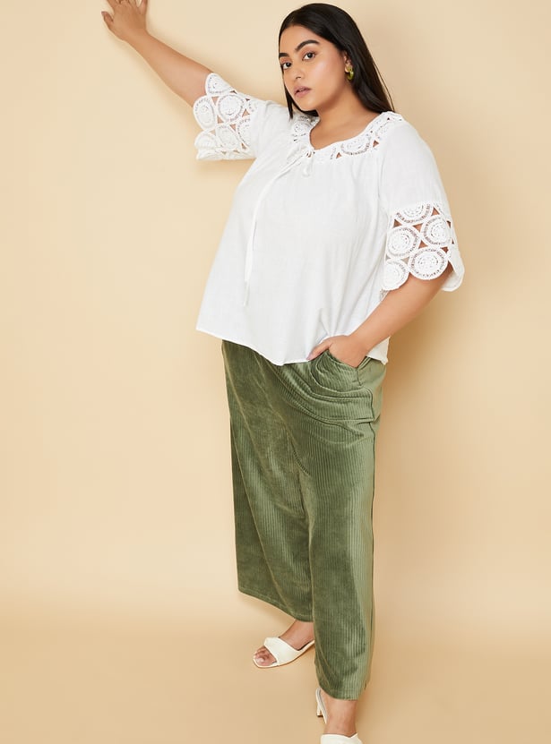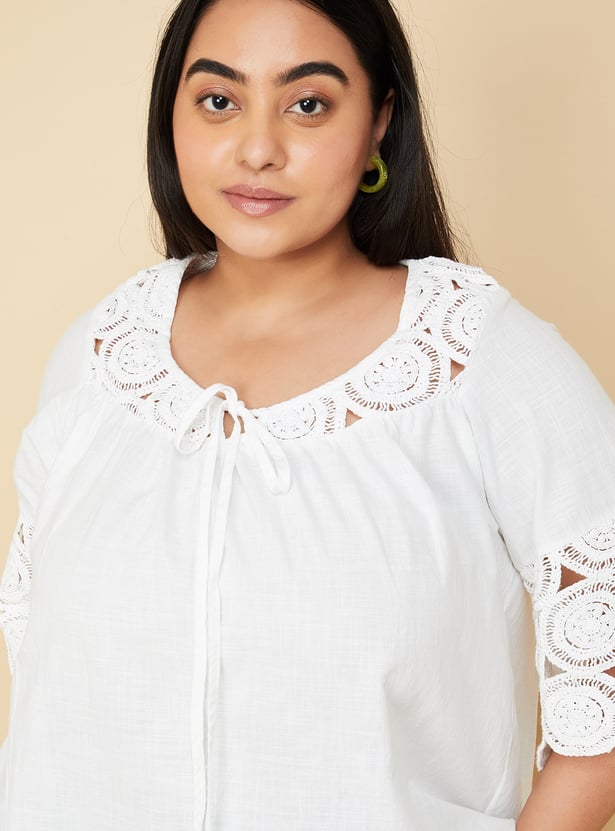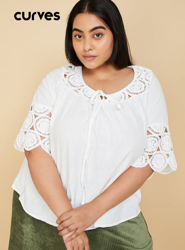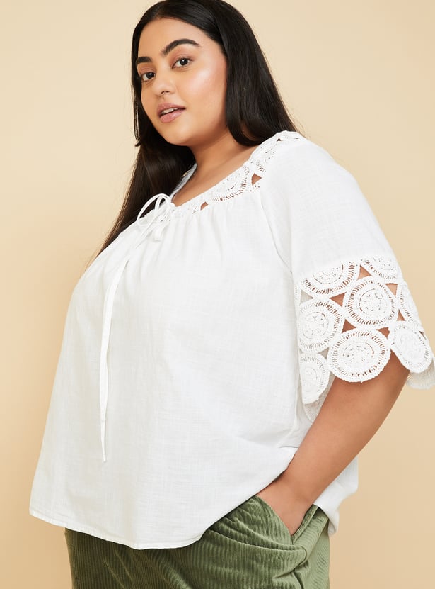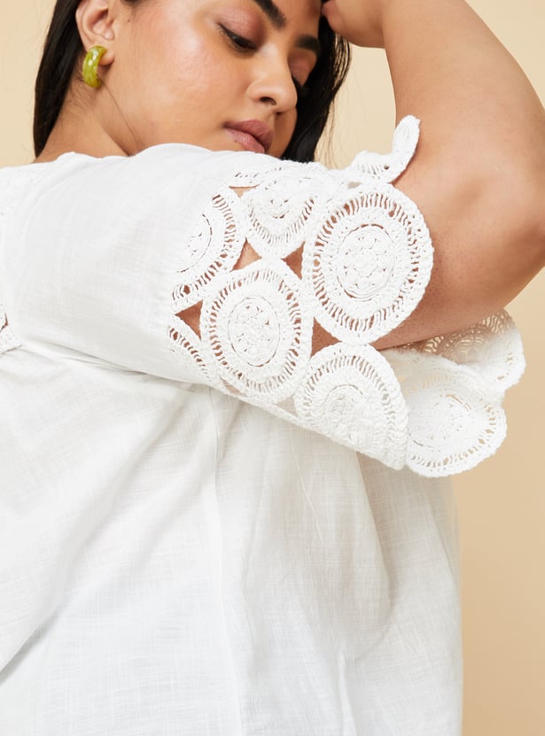 Enhance your wardrobe with this elegant top featuring crochet lace detailing on the yoke and cuffs. With a tie-up neck, flared sleeves, and a solid bodice, it exudes sophistication and style.