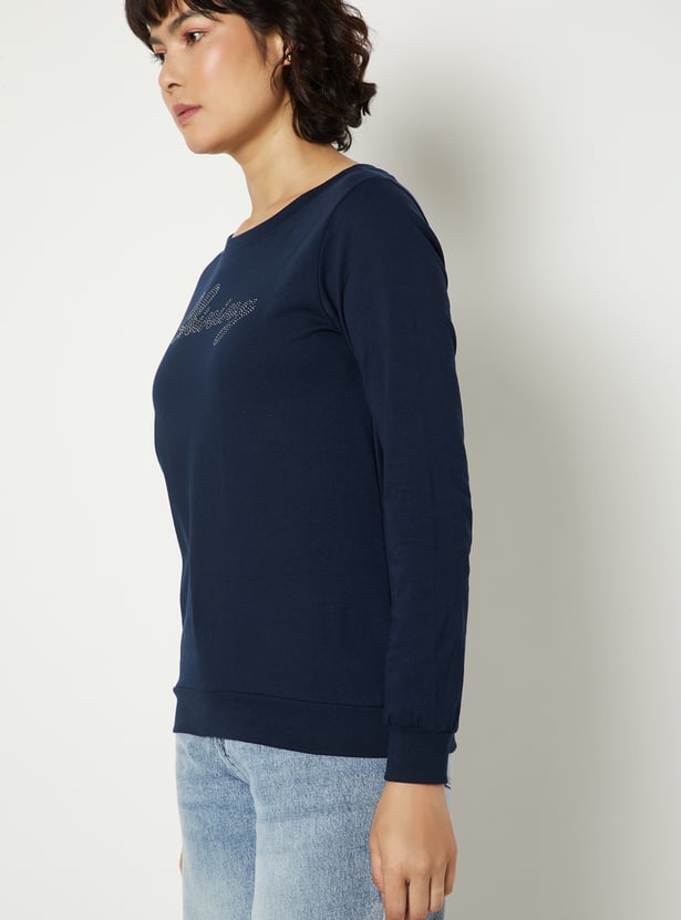 This round neck regular fit top features chic embellished detailing that adds a hint of sparkle to your everyday style. Designed with full sleeves, it offers a balance of comfort and sophistication.