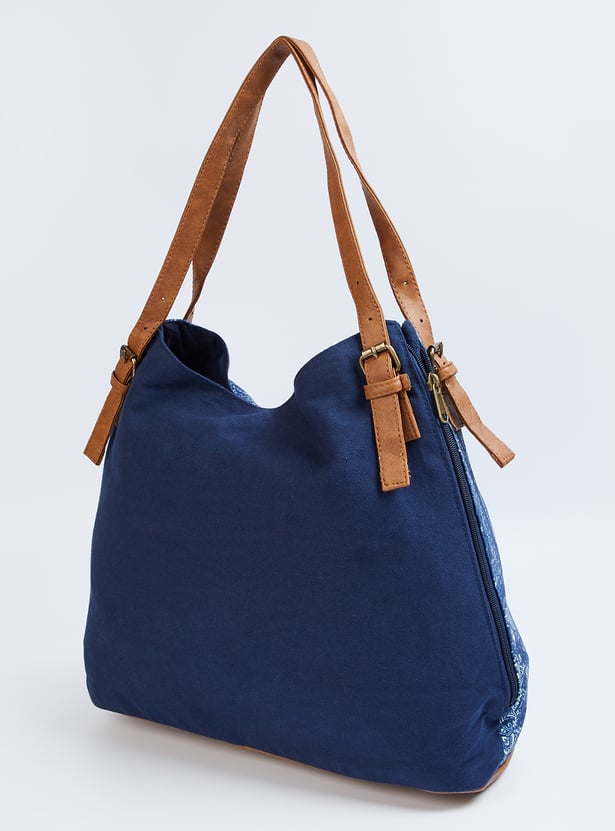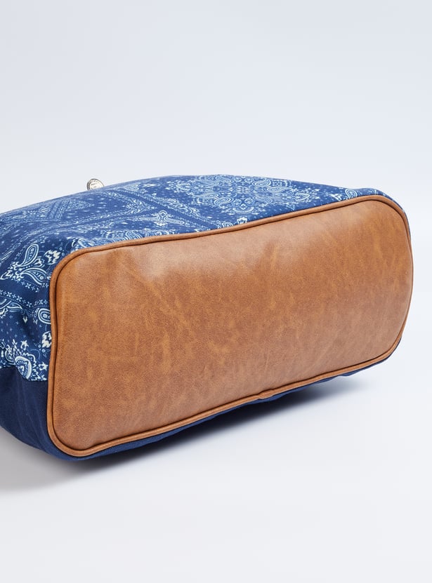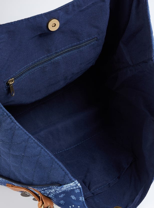Add flair to your outfit with this tote bag featuring a printed panel on the front exterior, adjustable flat straps, and an embellished accent. It includes a spacious main compartment with a magnetic button closure and internal pockets, combining style with practicality for all your essentials.