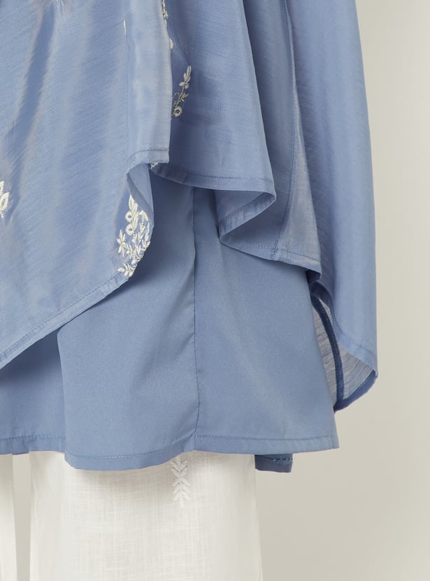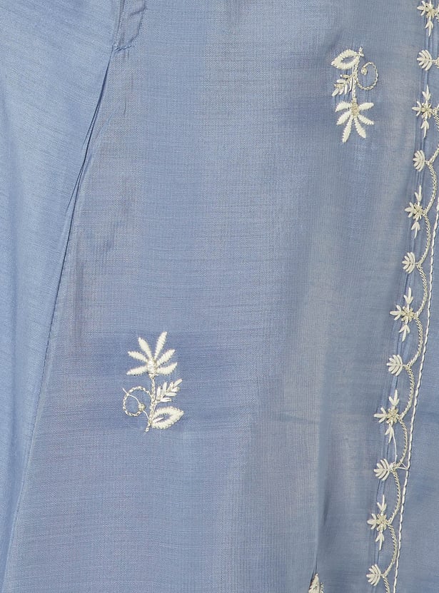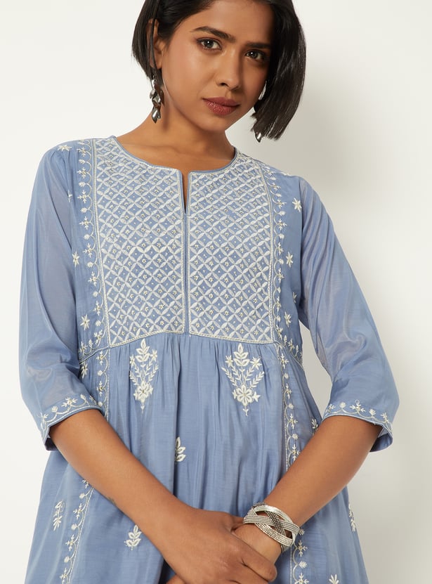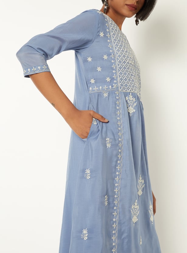 This embroidered A-line kurta features a detailed yoke with a notch neckline for a refined finish. Designed with 3/4th sleeves and a functional side pocket, it balances comfort with graceful styling.