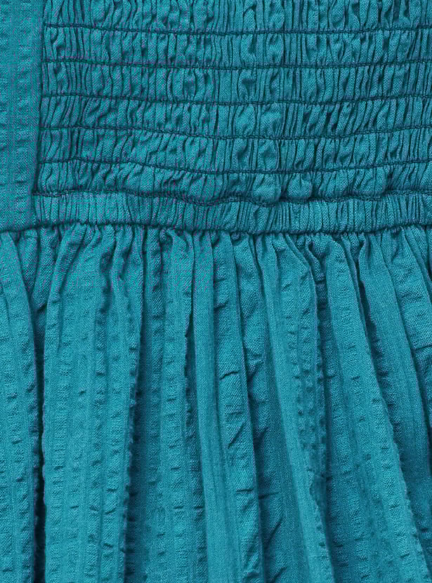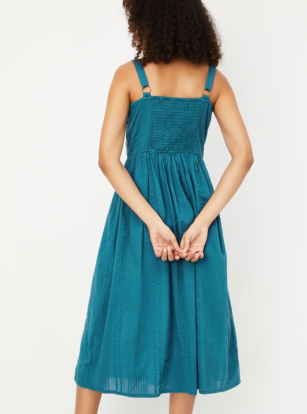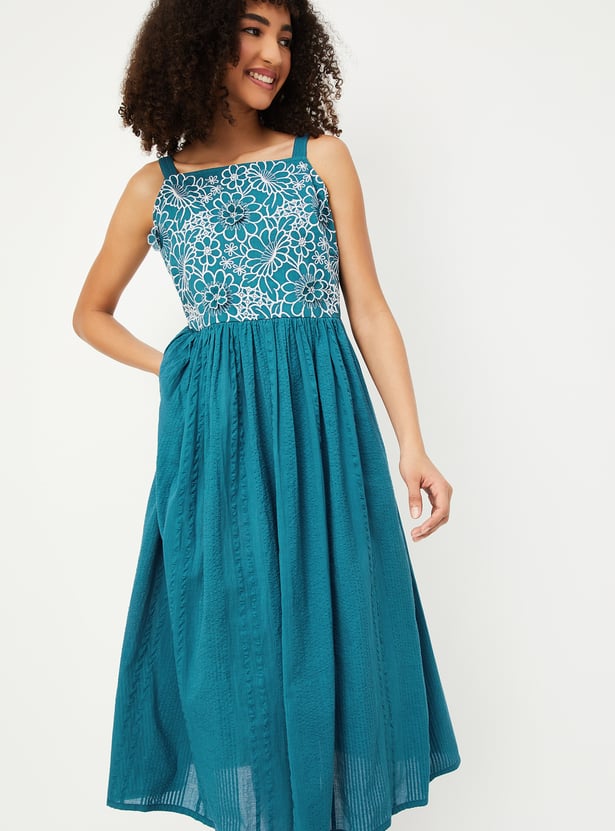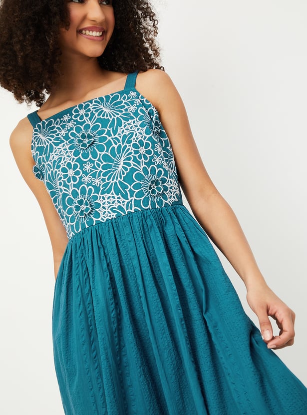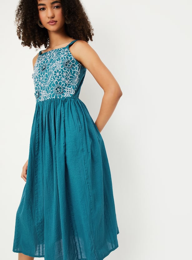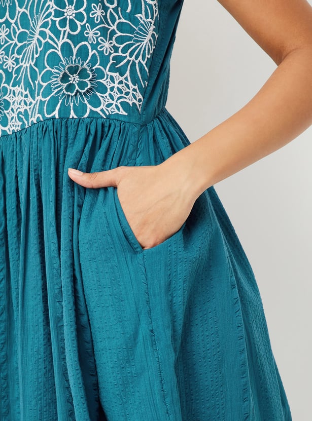 Effortlessly pretty, this embroidered A-line dress features a flattering square neckline, knee-length, adjustable straps, and a smocked back for a flexible fit. Finished with side pockets, it’s as practical as it is charming.