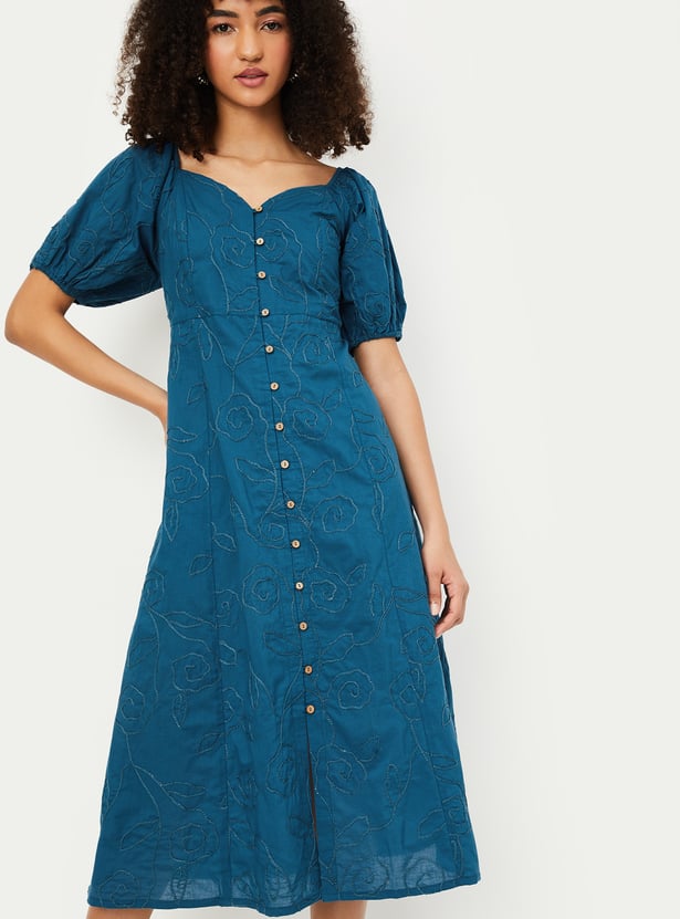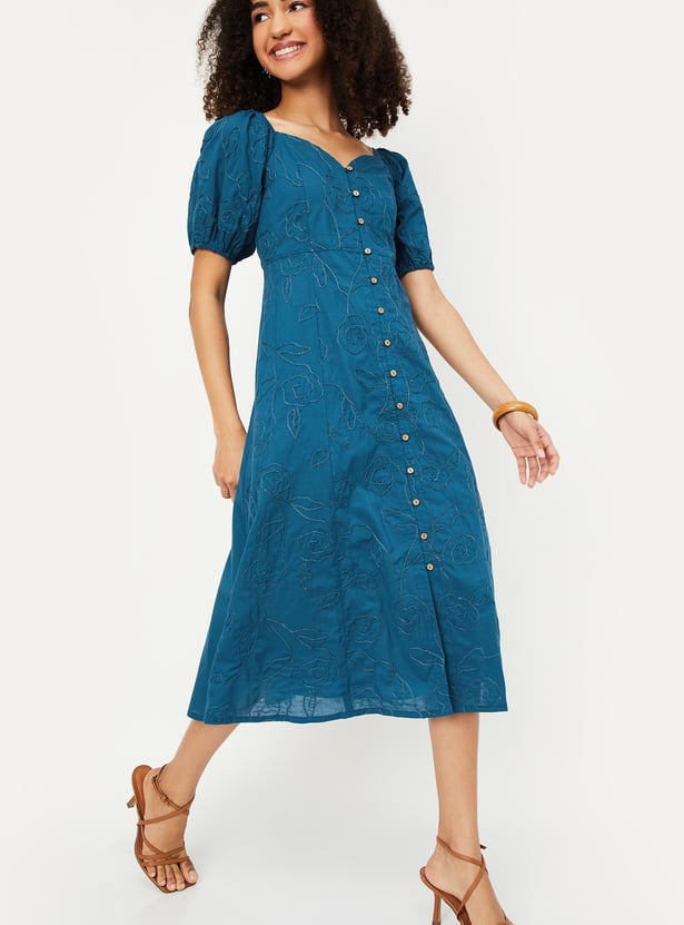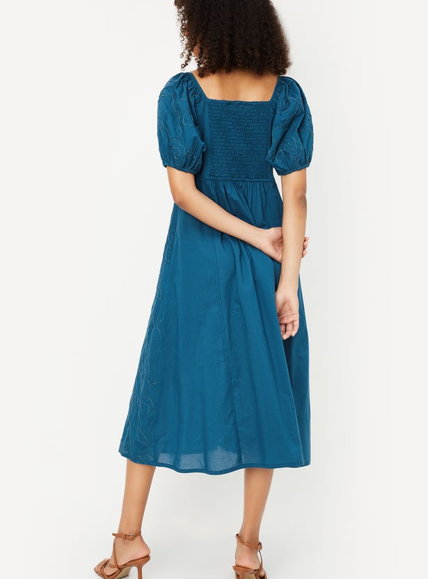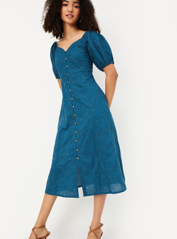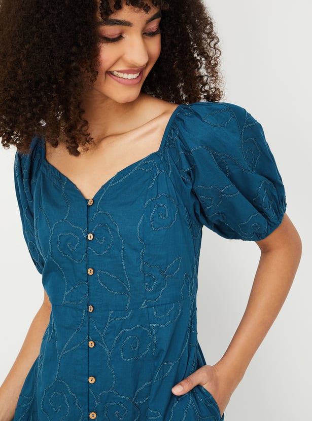 Turn heads with this embroidered A-line dress designed for effortless charm! It features a sweetheart neckline, puffed sleeves, and a smocked back for a flattering, flexible fit. The functional pocket adds a touch of practicality to its romantic silhouette—perfect for brunches, date nights, or festive soirées.