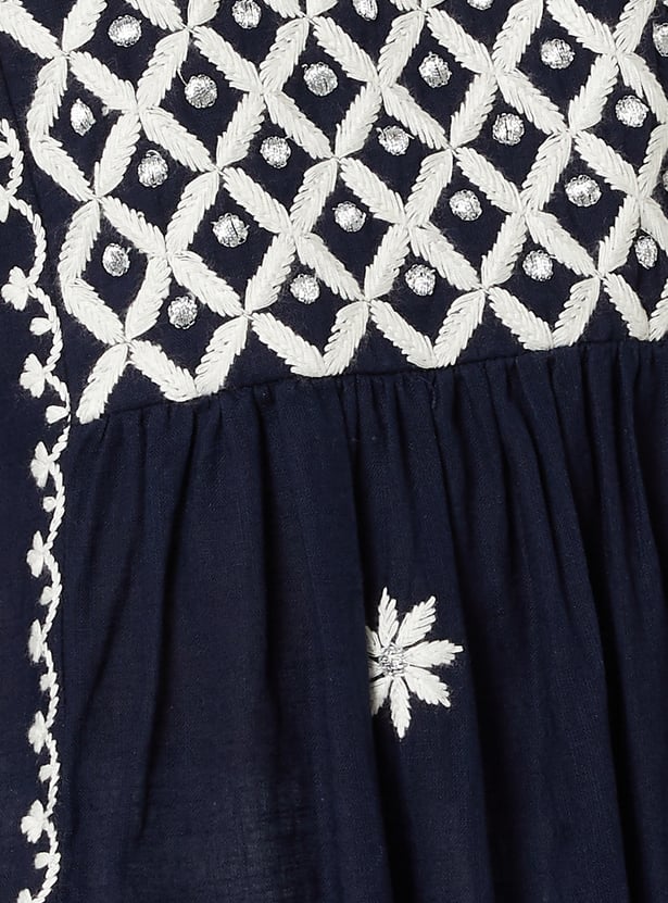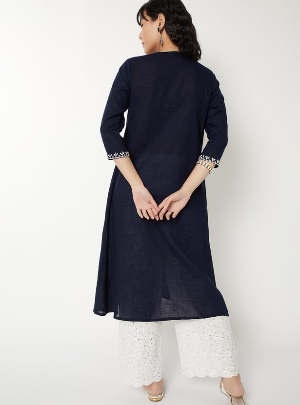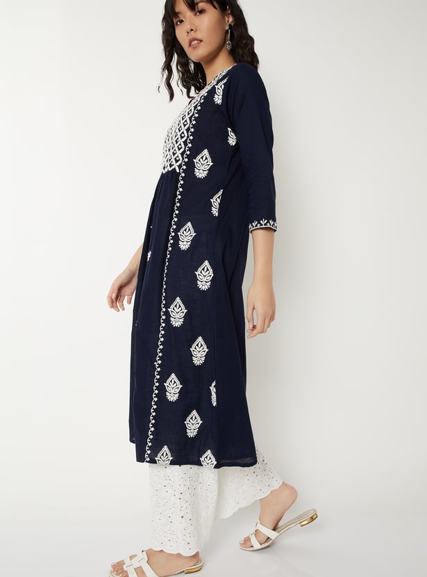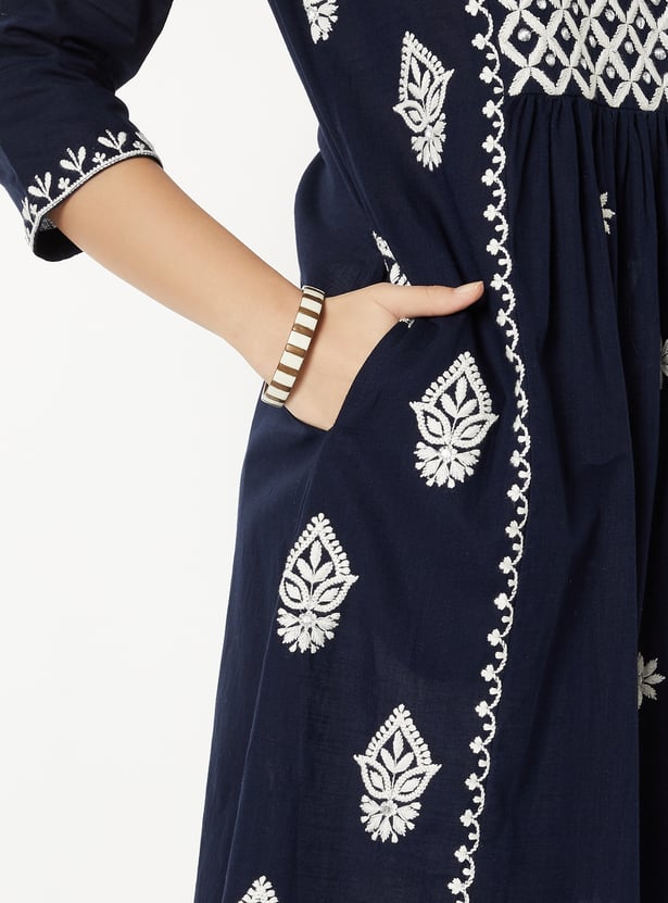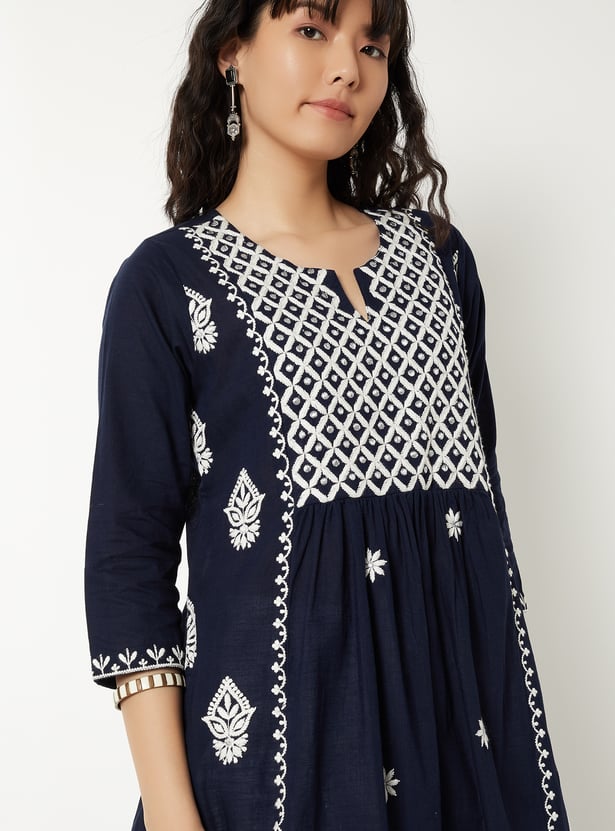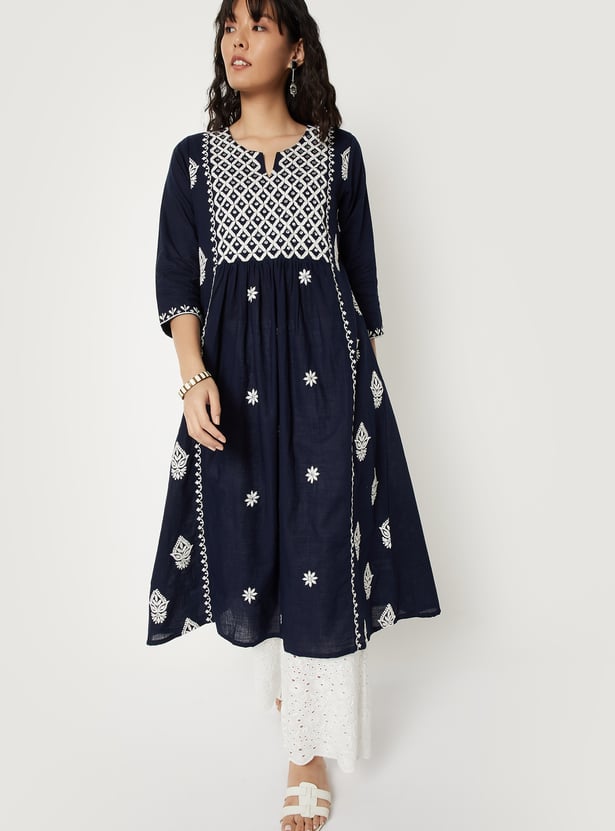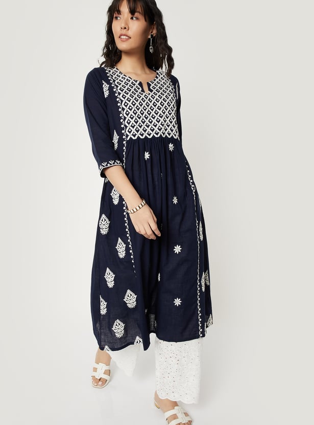 Elegant and versatile, this embroidered A-line kurta is designed to flatter with ease. Featuring a notch neck and 3/4th sleeves, it blends timeless detailing with a graceful silhouette.