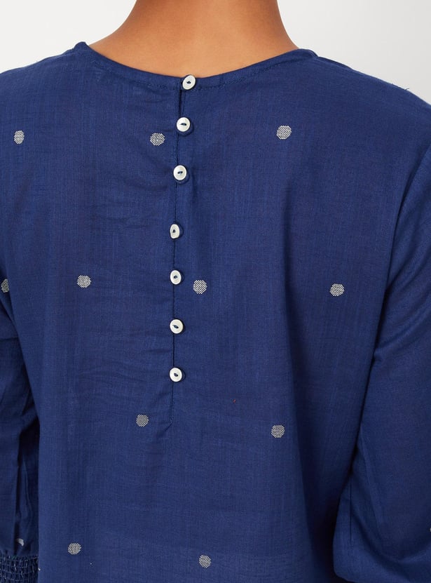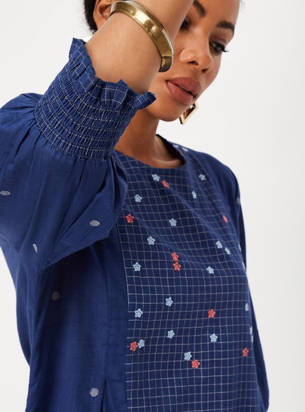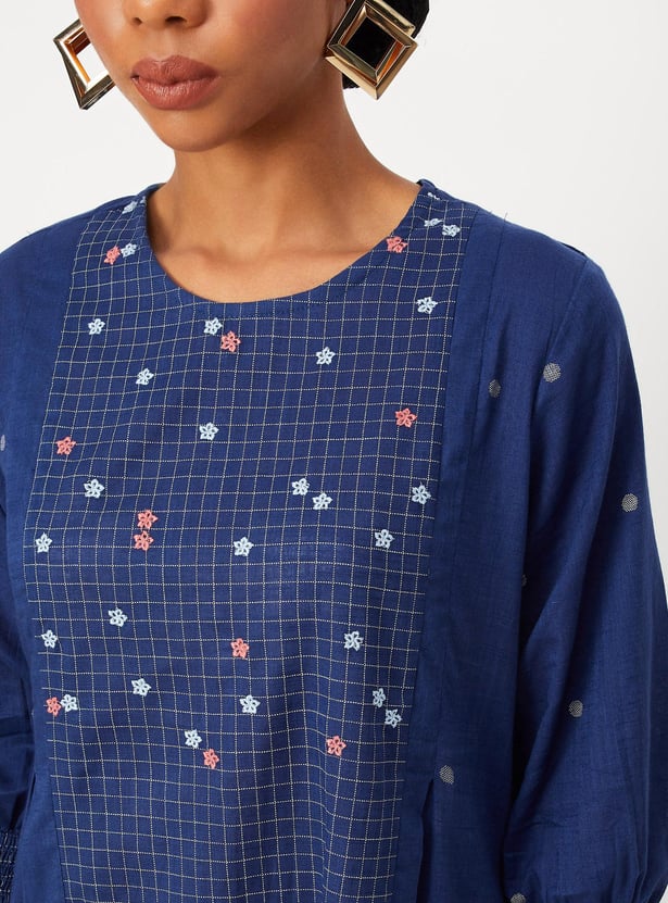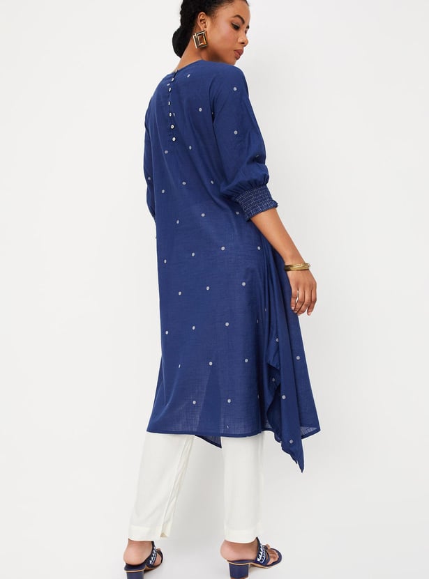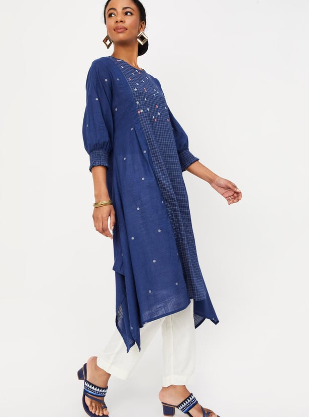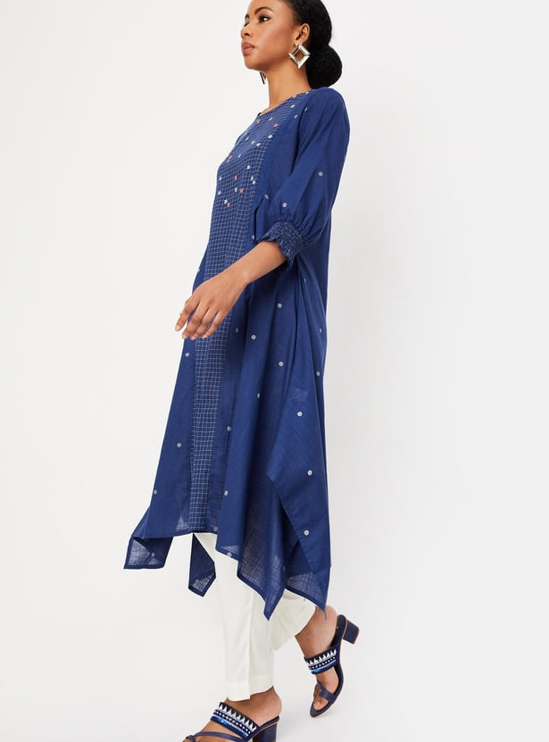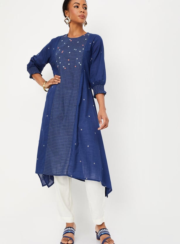 Fill your wardrobe with a flattering ethnic collection. This asymmetric kurta is designed with an embroidered surface, a round neck, three-quarter sleeves, an asymmetric hem, and calf-length construction. Team this kurta with a pair of straight pants and heels to make your outfit look complete and elegant.