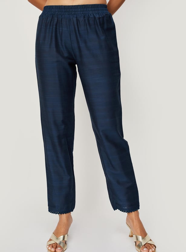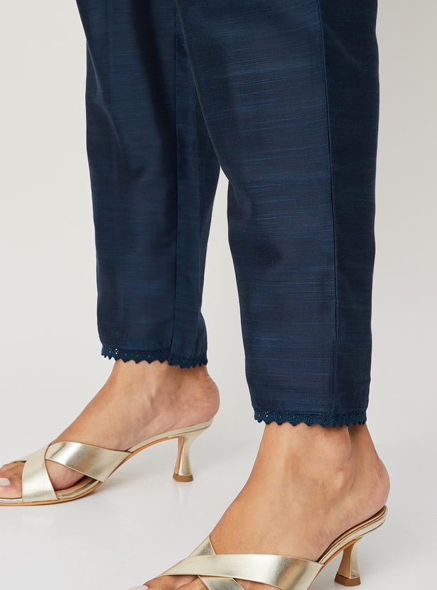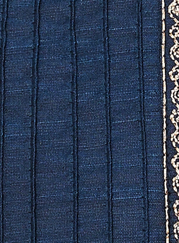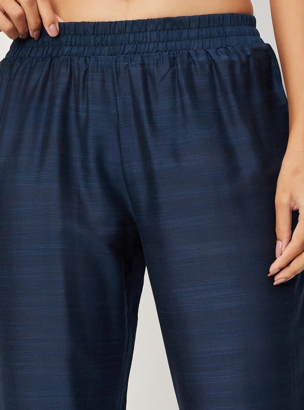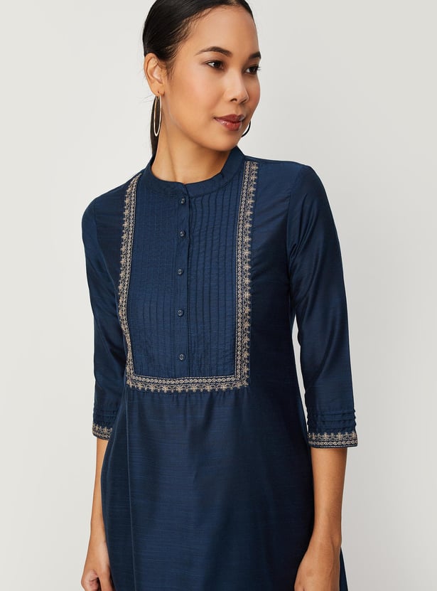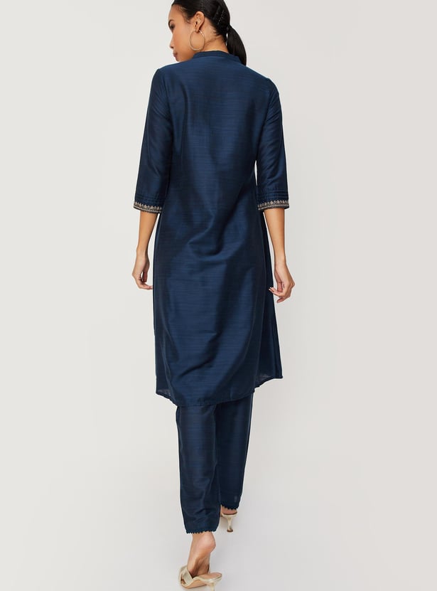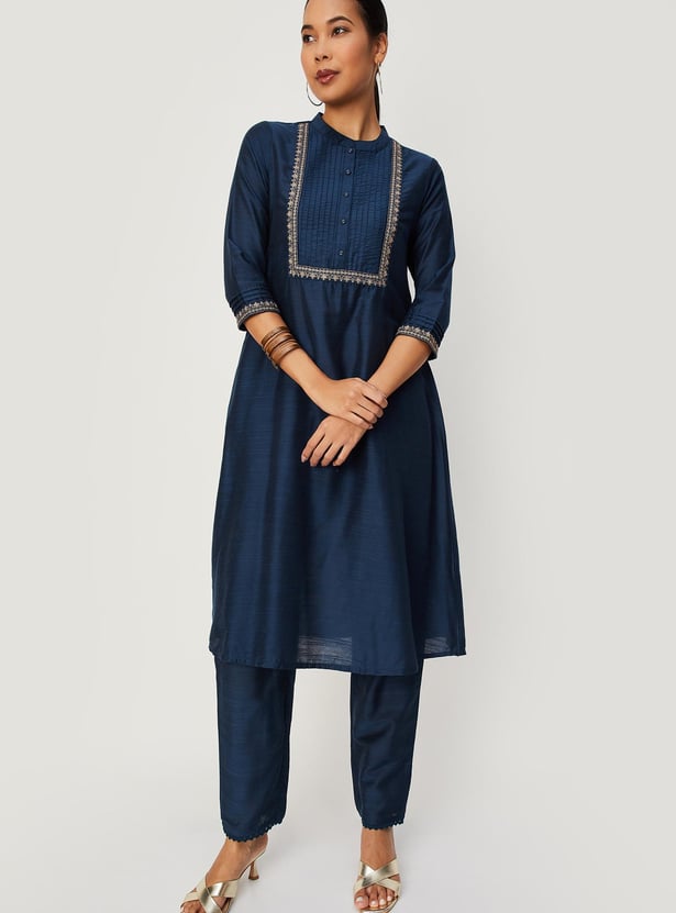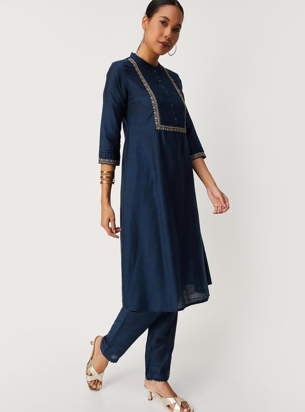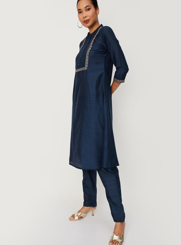 This kurta set with a band collar, three-quarter sleeves, pin tuck, and embroidery design at the yoke that gives a touch of elegance. It comes with matching straight pants with an elasticated waistband to complete your look.