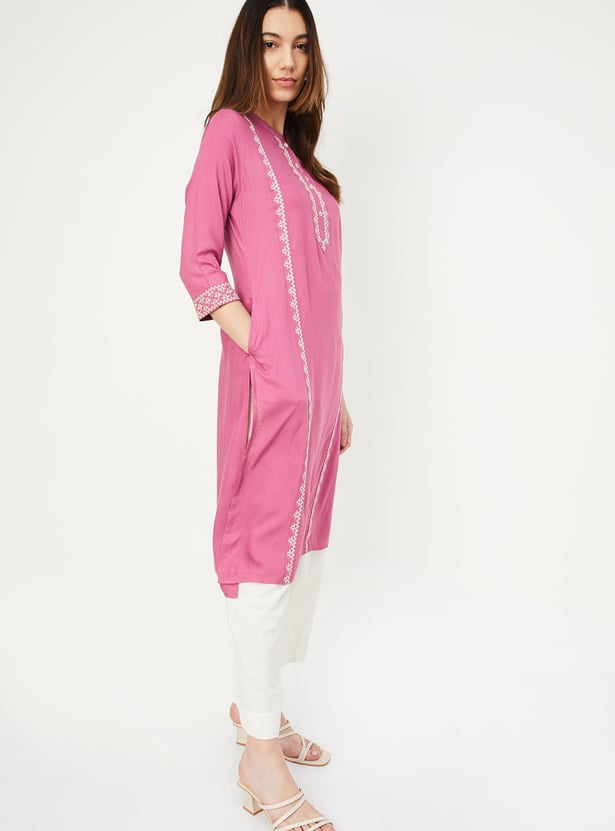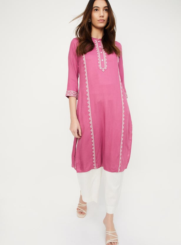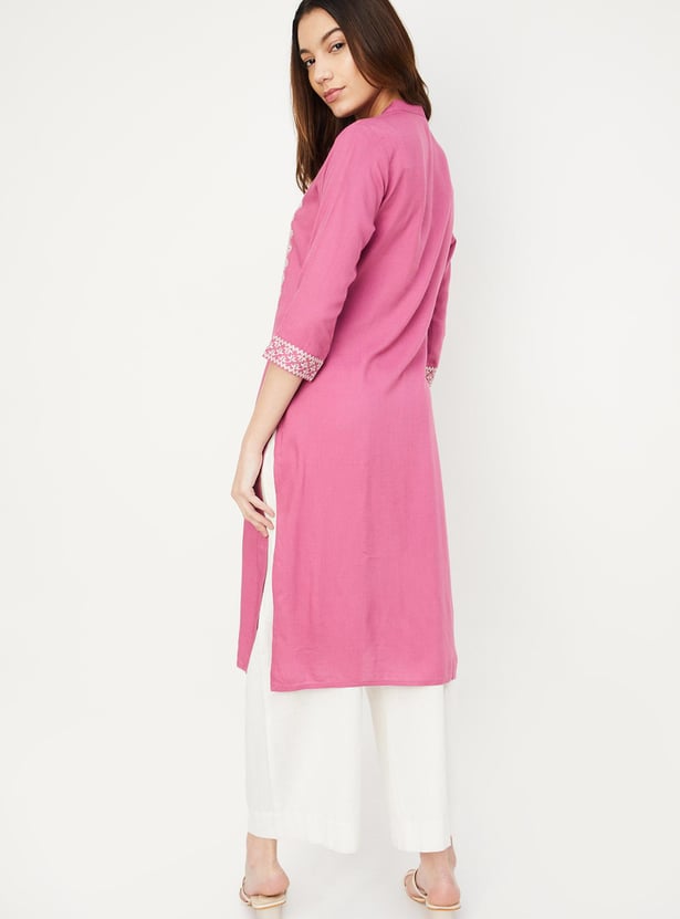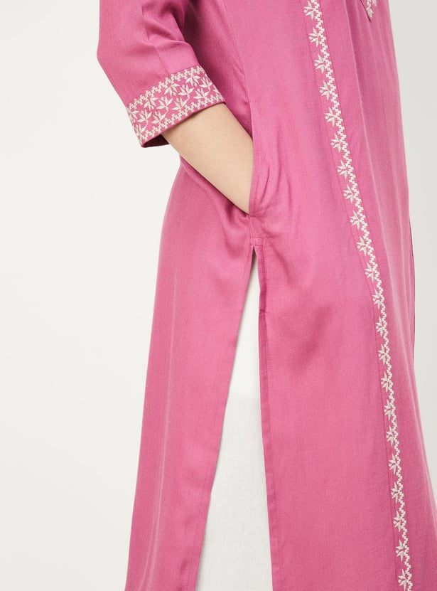 Create an effortless look with this straight kurta. It has three-quarter sleeves, pockets, a band collar with an embroidery design on the front and a button placket.
