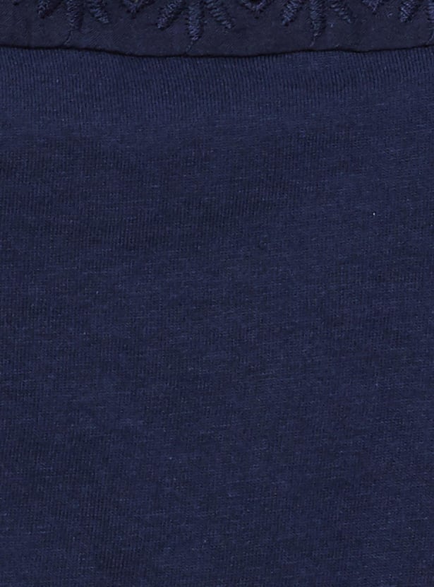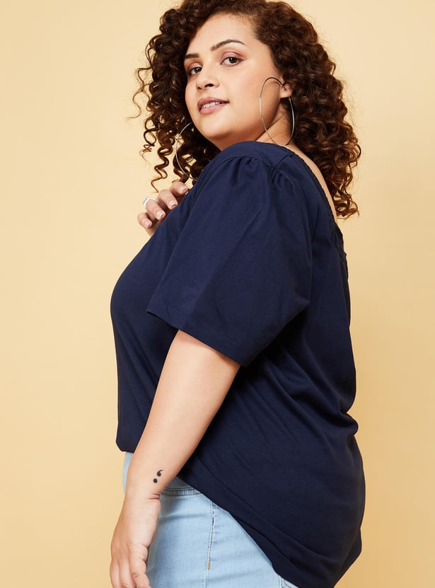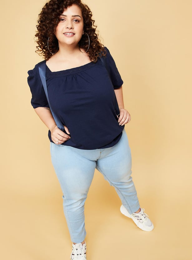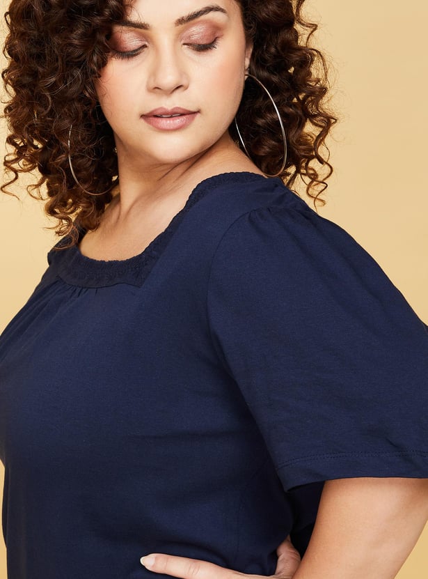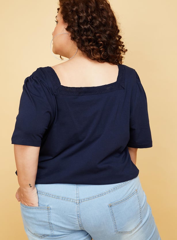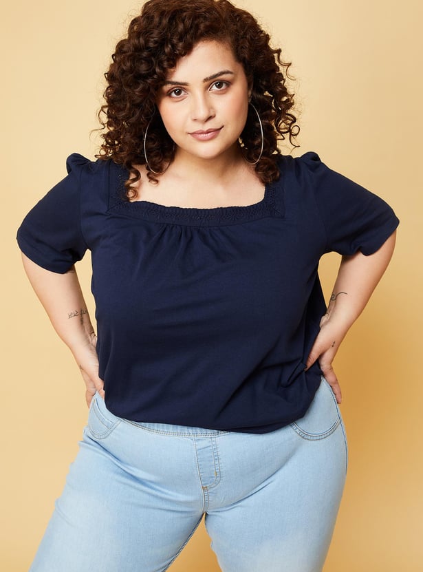 Build your casual wardrobe with this top highlighted with a tonal embroidered neckline. It is designed with a square neck, short sleeves, gathering at the neck, and a curved hem. Style this top with a pair of jeans and sneakers to ace the look.
