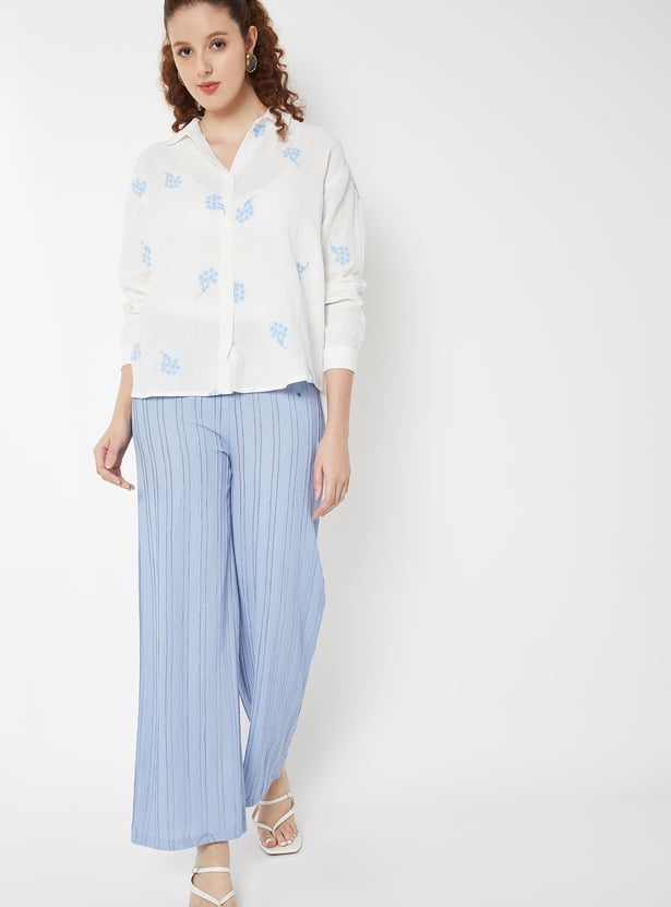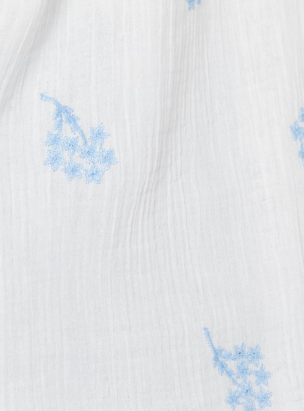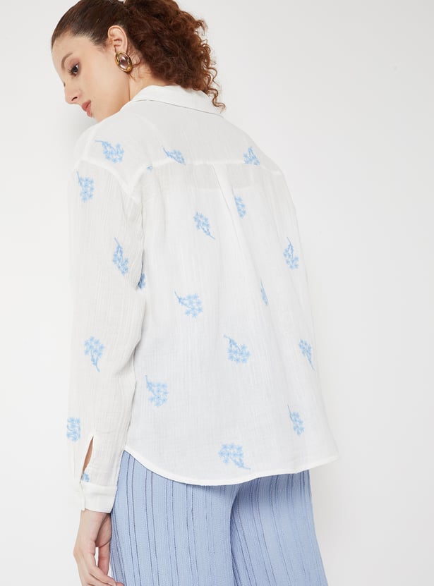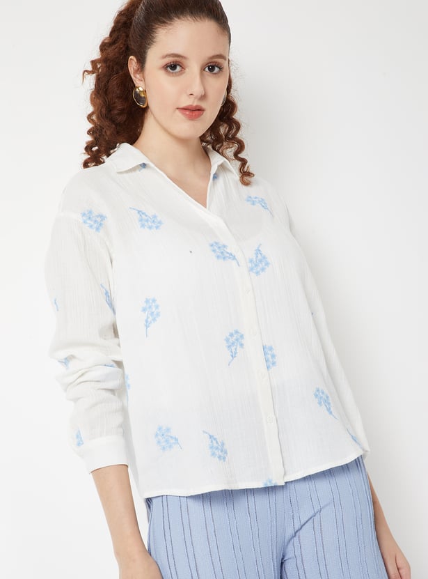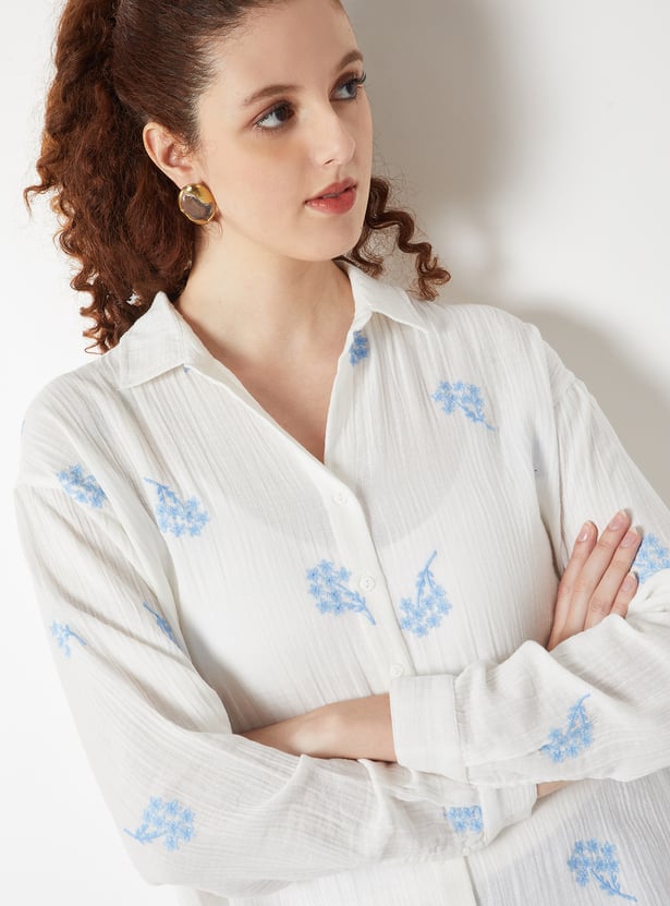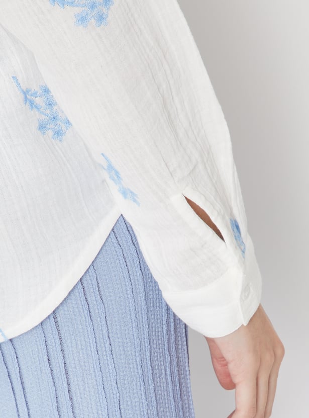 Elevate your everyday style with this embroidered shirt. Designed with a spread collar and cuffed full sleeves, it features all-over embroidery that adds an elegant touch. The curved hem enhances the silhouette for a polished finish. Model Size :