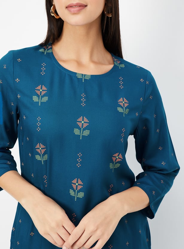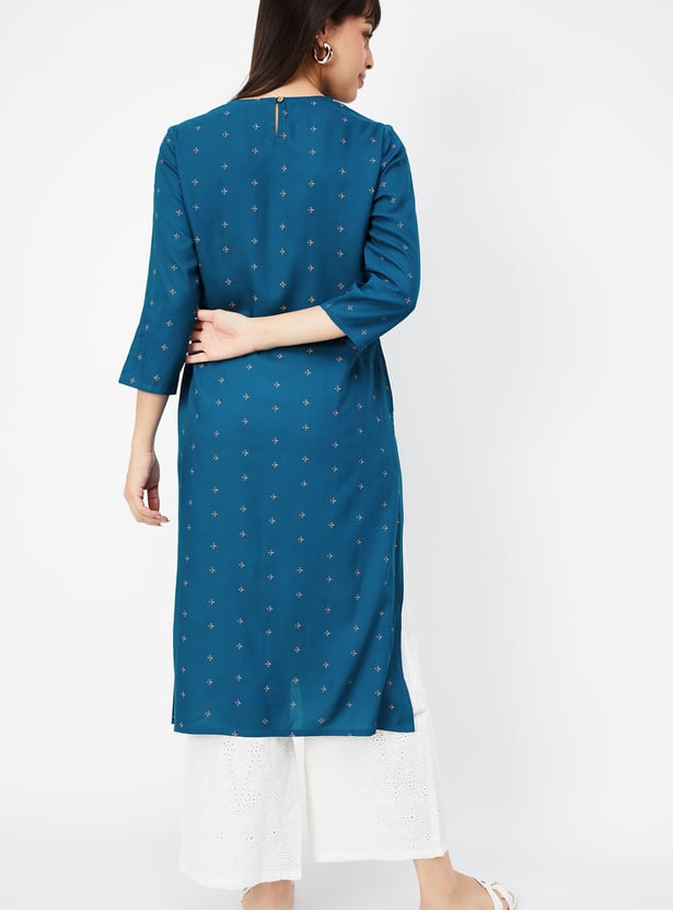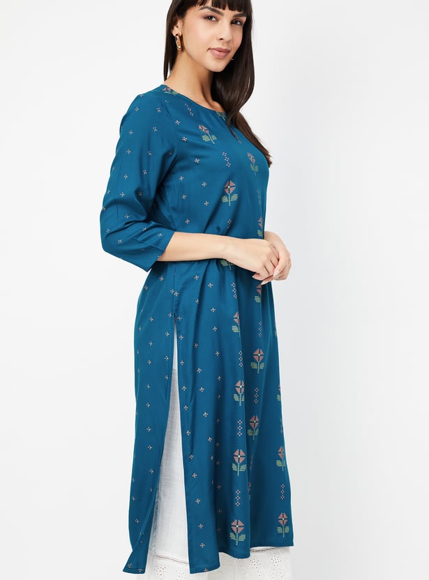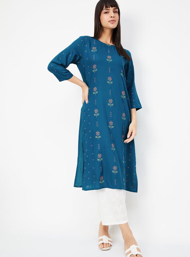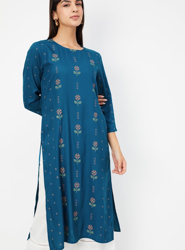 Elevate your everyday style with this embroidered straight kurta, featuring a classic round neck and 3/4th sleeves. Designed with side slits for ease of movement and a flattering silhouette, it blends traditional charm with modern simplicity.