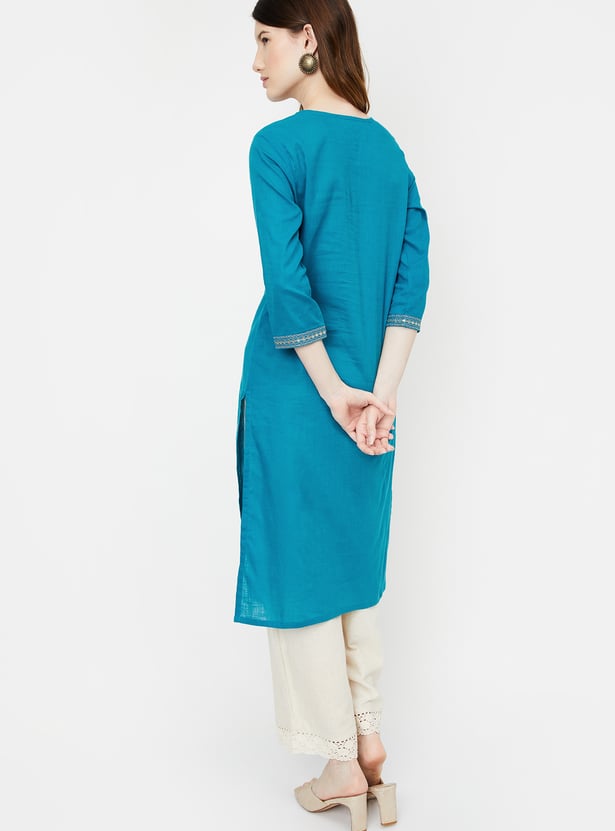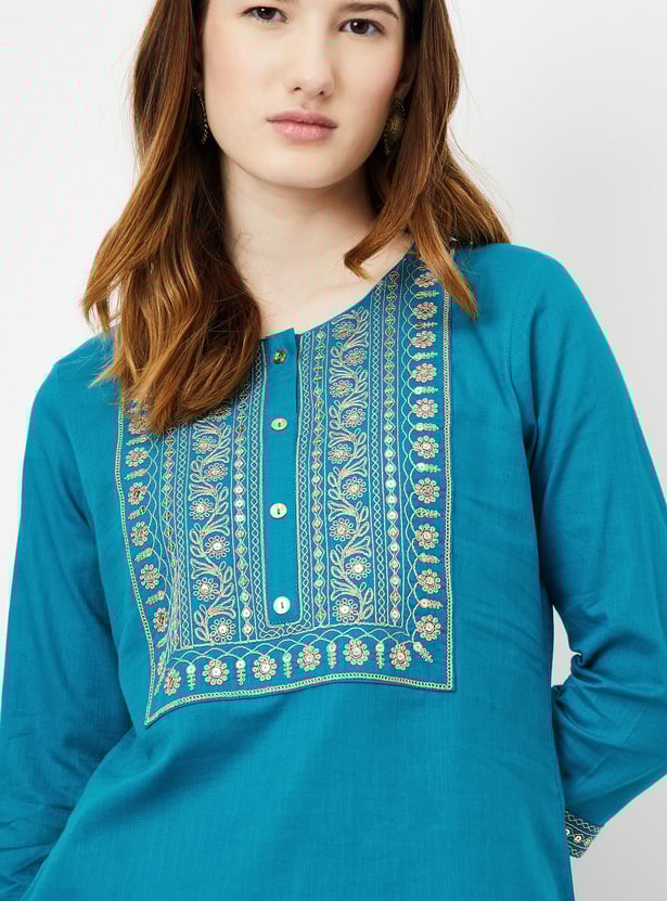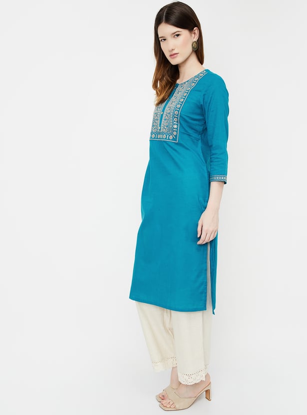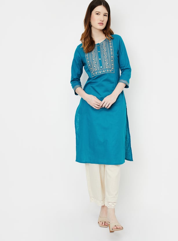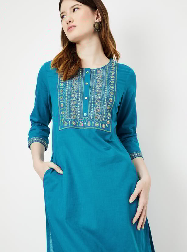 Achieve an effortlessly chic look with this straight kurta. Featuring three-quarter sleeves, a round neckline, and a button placket, it combines style and comfort seamlessly. The embroidered yoke adds a touch of elegance, making this versatile piece perfect for various occasions.