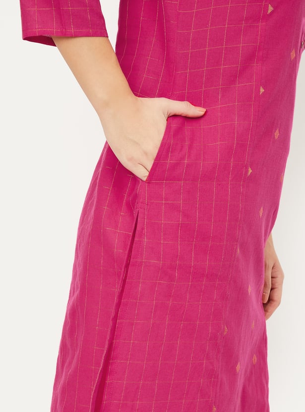 This embroidered straight kurta features a mandarin collar, 3/4th sleeves, side pocket, and side slits for added comfort and movement. The intricate embroidery adds a touch of elegance to its simple, classic design.